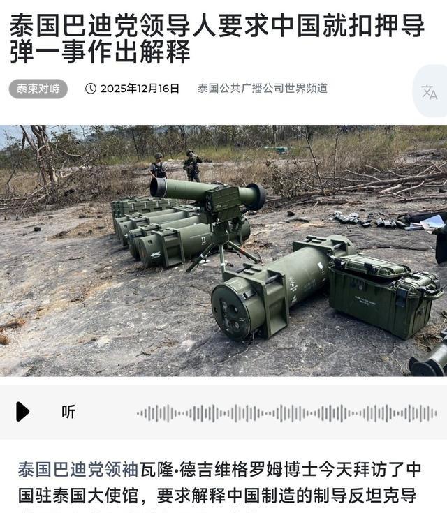 缴获中制先进武器后,泰国在野党冲到大使馆,要求中方给个解释。 泰柬边境争端由来已久,从上世纪的殖民遗留问题,到现在2025年的武装对峙,都绕不开领土划界的旧账。两国边界线长达八百多公里,好些地方因为老地图模糊不清,经常闹出摩擦。最早的导火索是1904年和1907年的法暹条约,那时候泰国还是暹罗,法国殖民者强行划界,留下一堆烂摊子。后来1962年国际法院判了柏威夏寺归柬埔寨,泰国人咽不下这口气,边境小冲突就没断过。2011年那次打得挺凶,双方动用炮火,死伤几十人,联合国还插手调解。可这些年,经济合作表面上热络,底下暗流涌动。 今年5月28日,冲突又起头,在翡翠三角区爆发的十分钟交火,柬埔寨士兵苏恩·朗中尉阵亡,双方互相指责先开火。7月24日升级成大规模对抗,柬埔寨火箭弹打进泰国境内,泰国出动F-16战机空袭回应,这是泰国空军自上世纪80年代泰老边境战后头一次实战。战斗波及多个省,炮火连天,平民死伤,数万人流离失所。泰国发起“优他博丁”攻势,占了几个高地,柬埔寨用BM-21火箭反击。7月底在马来西亚普特拉贾亚谈成停火,美国和中国使节都掺和调解。可没消停多久,12月7日又打起来,35分钟小规模交火后,泰国空袭柬埔寨阵地,推进到北部地区。 12月14日,泰国军拿下677号高地,实际是叫山500或崇安马高地,从柬埔寨阵地缴获五套GAM-102LR反坦克导弹。这种导弹是中国产,射程四公里,能穿一千毫米装甲,对泰国自己的VT-4坦克威胁不小。泰国军方低调处理,说按规矩留着用,没提归还。中国使馆早有声明,冲突后没给柬埔寨供过弹药,这些是之前军贸存货。中泰柬军贸公开透明,泰国买了中国坦克和护卫舰,总值几十亿美元,柬埔寨买导弹也一样,纯商业买卖。国际上这种两头卖武器的事儿常见,美国卖给以色列也卖给沙特,没人闹腾。 泰国保卫党党首瓦隆·德吉维格罗姆,12月15日带人去中国驻泰大使馆抗议,要求解释导弹怎么到柬埔寨手里的。他是医生出身,转政坛后创立保卫党,强调民族主义,保卫君主制。党在2023年大选中没拿多少席位,但靠街头行动和媒体曝光维持影响力。瓦隆过去组织过集会,反对青年抗议,批评他们动摇传统。这次行动,借导弹事儿炒作,核心瞄准明年2月大选,拉选票。右翼政党爱用民族情绪绑架舆论,把复杂边境争端简化成中国偏帮柬埔寨的叙事,塑造自己硬汉形象。 中国当天使馆发声明,对冲突死伤表示遗憾,优先呼吁停火,已通过多渠道和两国沟通,支持东盟调解,尤其是马来西亚角色。中国外交原则是不选边站队,对泰柬平等合作。中泰贸易2024年超1300亿美元,中国连续九年是泰国最大伙伴;对柬埔寨,投资基建帮经济发展。推动停火符合地区利益,不是政治支持谁。泰国军方懂行,没大惊小怪,视武器贸易和战场站队为两回事。 保卫党这套路在泰国政坛老生常谈,2013年反对英拉政府,就炒特赦法案,占财政部冲总理府,把政治变街头秀。现在搬到大使馆,换汤不换药,借敏感话题捞资本。不管边境50万平民流离,士兵家庭破碎,只要上新闻涨支持率就行。泰柬冲突本质是历史边界争议,武器产地无关紧要。双方装备混杂,中国导弹俄罗斯炮美国步枪,总不能挨个出口国问责。中国劝和促谈,声明说对打仗痛心,最紧要停火,这比政党表演务实。 对比美国,出过武器通过约旦给叙反对派,转手黑市打美国人,也没政客怪出口本身。中国管控严,法规兜底。保卫党忽略事实,搅浑水,把外交当选举道具。大选后热度散,他们多半不提导弹了,剩一地鸡毛,苦的是民众。政客眼里,选票比和平重,抗议不过是竞选插曲。