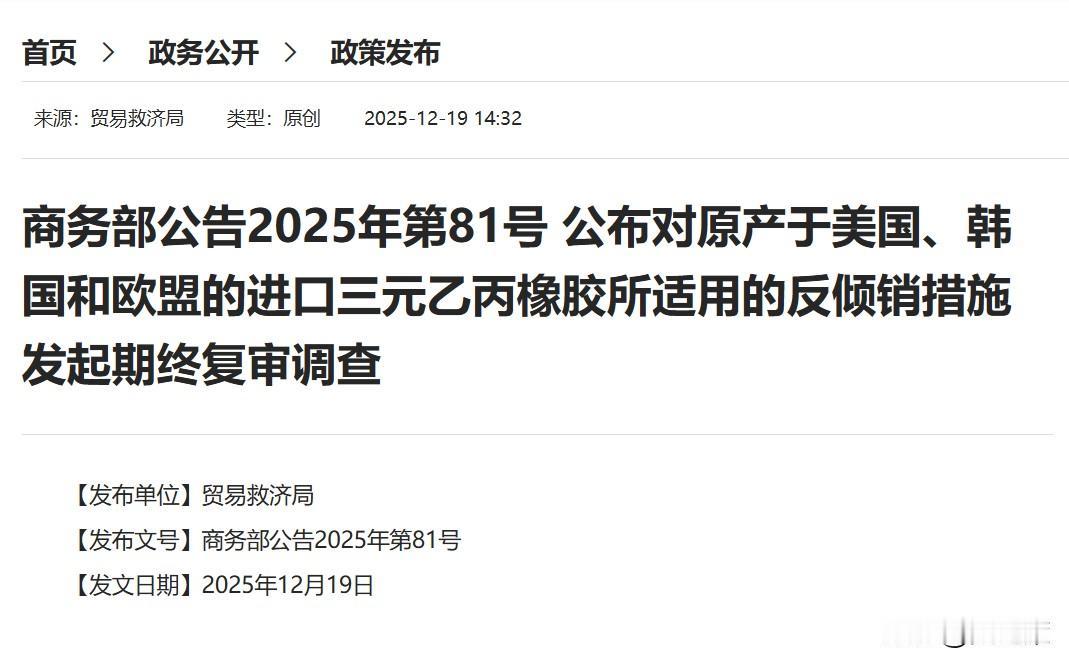 12月19日,特朗普不会想到,中国对美国的反击一波又一波。商务部刚刚宣布,对原产于美国的进口三元乙丙橡胶继续征收反倾销税,最高税率222%。 值得注意的是,商务部的公告并不仅仅针对美国,还对来自欧盟、韩国的进口三元乙丙橡胶继续征收反倾销税。既然是继续,说明之前就有过。2020年12月20日,商务部宣布征收反倾销税,征税期限是5年。也就是说,按照原定期限,2025年的12月20号,也就是明天到期。 而就在今年的10月份,国内有公司向商务部提出申请,认为如果停止征收反倾销税,那么对原产于美国、韩国和欧盟的进口三元乙丙橡胶对中国的倾销可能会继续发生。因此,希望商务部能够对进行期终复审调查,并维持该反倾销措施。 什么意思?就是说之前快到期了,但是如果停止征收反倾销税,那么就有可能继续对国内相关产业造成损失。希望能够重新审查“到期时间”。而在审查结果出来之前,将继续保持之前的征税水平。其中,税率为美国公司214.9%—222.0%,韩国公司12.5%—24.5%,欧盟公司14.7%—31.7%。 在这当中,必须要指出的是,英国在2020年12月31日结束了脱欧过渡期。而在之前的反倾销税中,即使英国脱欧了,也要继续对英征收反倾销税,同样是5年。不过,在这次的申请中,英国并不在继续审查的行列中。也就是说,此前针对英国的反倾销税结束了。 而在欧美韩这三方中,美国属于求锤的锤。这两天,中国对美国的反击可谓是一轮又一轮。先是12月17号,美国农业部说中国取消了13.2万吨的美国白小麦订单。然后是19号,商务部宣布继续对美产品征收反倾销税。 而之所以如此,完全是美国自找的,因为特朗普政府刚刚通过了任期内第2次对台军售,一口气涉及八项军备,总金额高达111亿美元,创下了历史新高。很明显,特朗普这是好了伤疤忘了疼,和中国的贸易战刚刚休战,又想起打台湾牌。 不过,从中国的反击力度上来看,不管美国打什么牌,中国的反应都很迅速。不管是此前的贸易战、稀土也好,亦或是可能存在的“台湾牌”也罢,中国的出招就是一个字:稳。不管美国怎么折腾,中国都会跟着反制,比如此前的关税。这样一来,就能做到不给美国钻空子的机会。