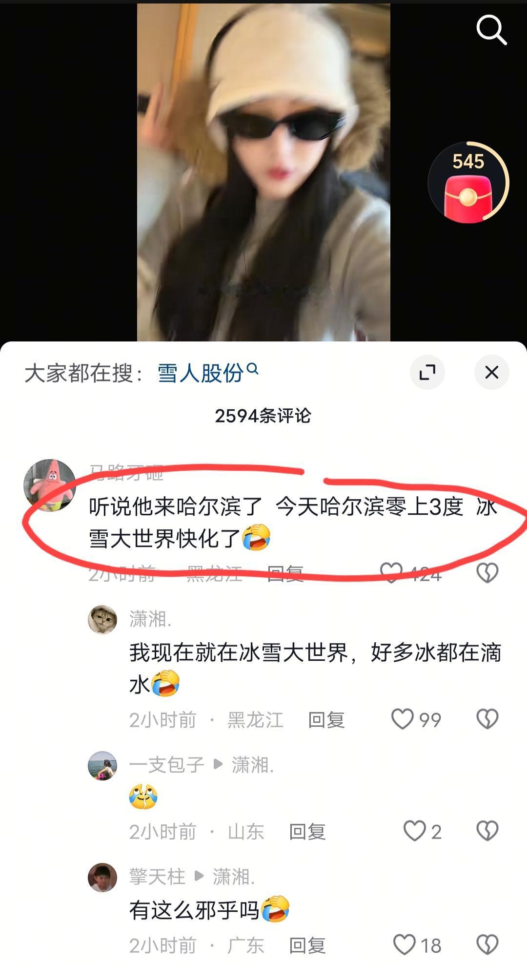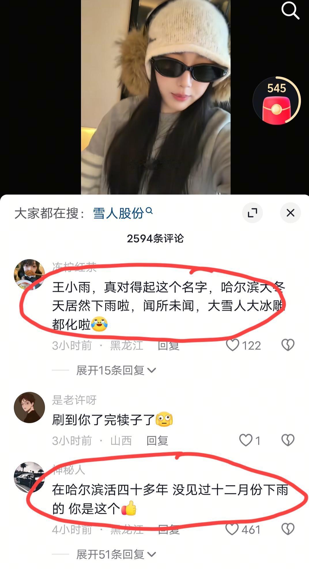 12月19日,黑龙江哈尔滨下起了百年不遇的沥沥细雨。据说上一次哈尔滨在12月份下雨还要追溯到遥远的1961年。 而昨天冰雪大世界刚刚开园。刚搭起来的这些雪人不会就化掉了吧? 有网友把这一切归咎于一位江苏的财经女主播——王晓雨,这位王晓雨号称“金融百草枯”、“反向锦鲤”。网友戏称“她每到一处,都会给当地的经济造成重创”,而且屡试不爽。这次轮到哈尔滨了,因为她昨天晚上刚刚到哈尔滨,今天哈尔滨就下起了百年不遇的大雨! 还有这种解读![大笑][大笑][大笑]