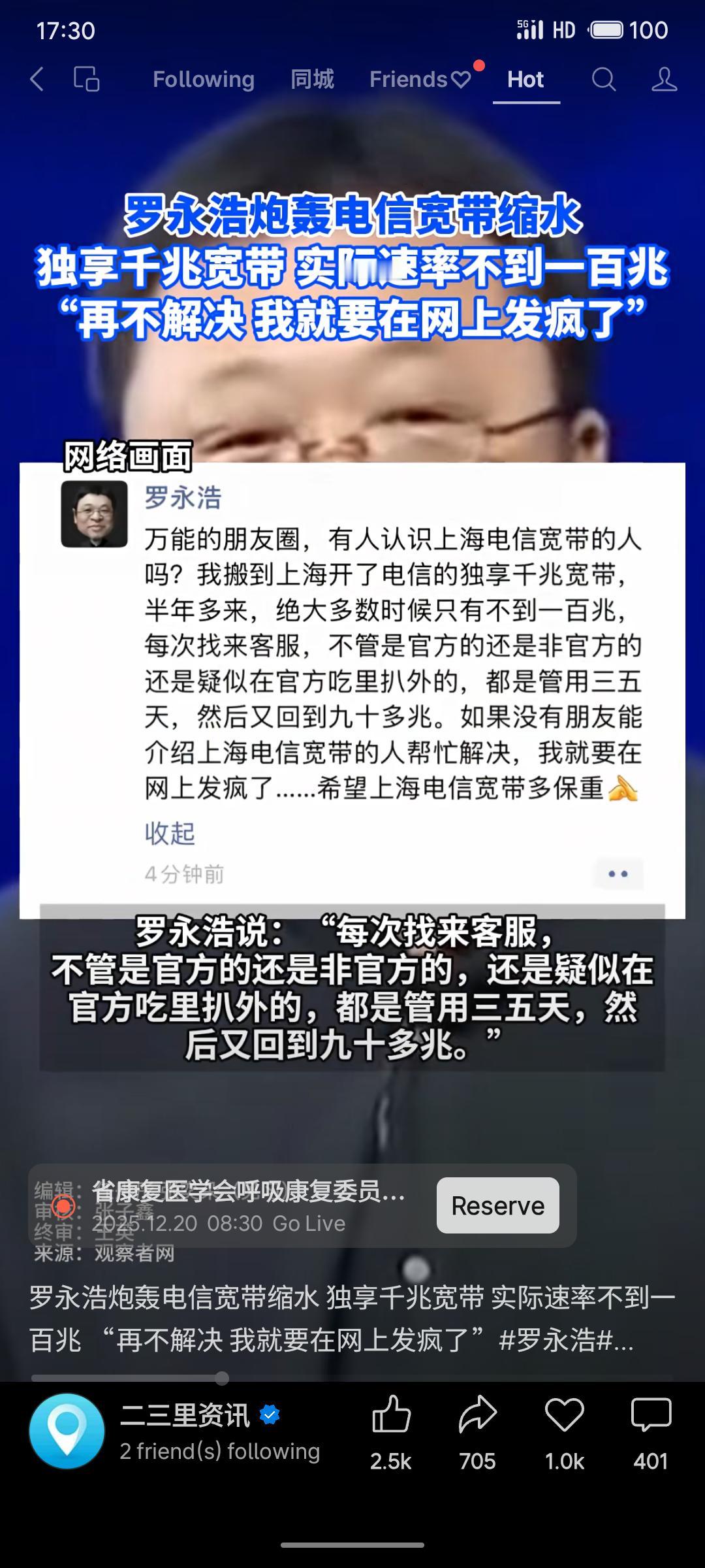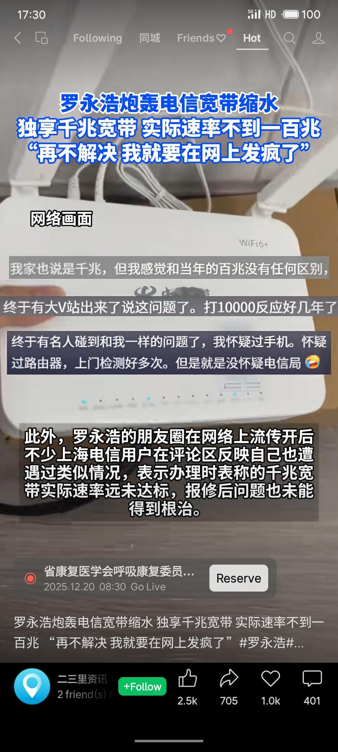 12月18日,罗永浩在朋友圈公开投诉上海电信宽带问题。他称自己办理的“独享千兆宽带”在半年多里实际速率大多不足百兆,多次报修后仅能短暂改善。此事引发众多用户共鸣,纷纷反映类似网速不达标的经历。