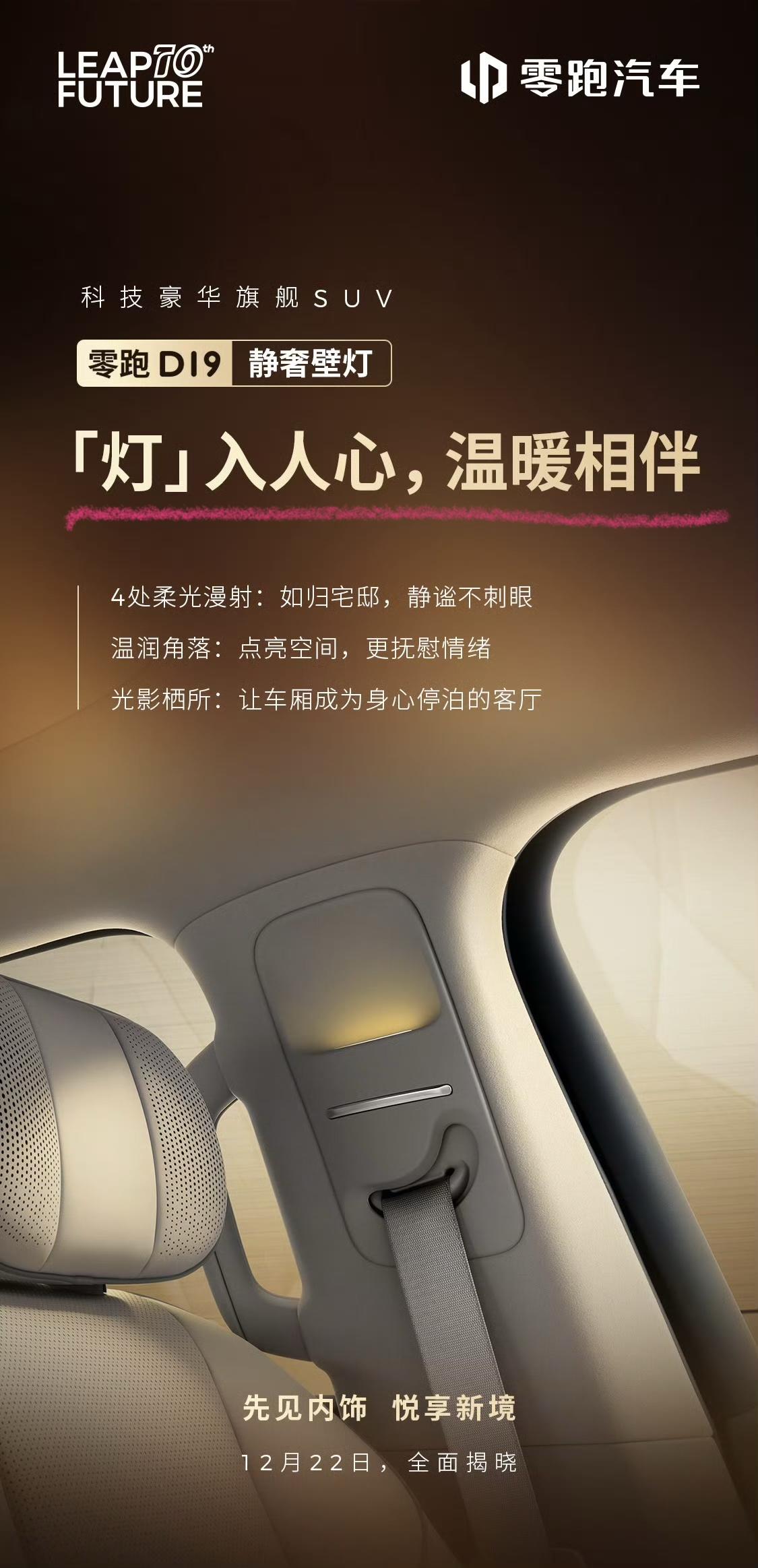 零跑这次把D19是是以豪车节奏来做,传播上抽丝剥茧释放产品信息,拿捏着腔调。 喜欢这个配置细节,但那句文案明显是多余和吵闹的。这个海报做的不够高级,是一个遗憾。 代言人费翔也是百老汇演员,D19车内壁灯的细节让我想到歌舞剧院。 瞬间一种宁静放松感。