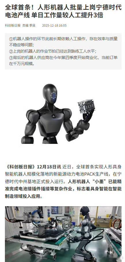 全球首条!人形机器人批量上岗宁德时代电池产线,单日工作量较人工提升3倍! 政府得抓紧研究下,机器人批量上岗后,被替换下来的人工该怎么安置?建议按机器人数量征税,或者对机器人产业的利润征特别税,取得税收用于下岗工人。