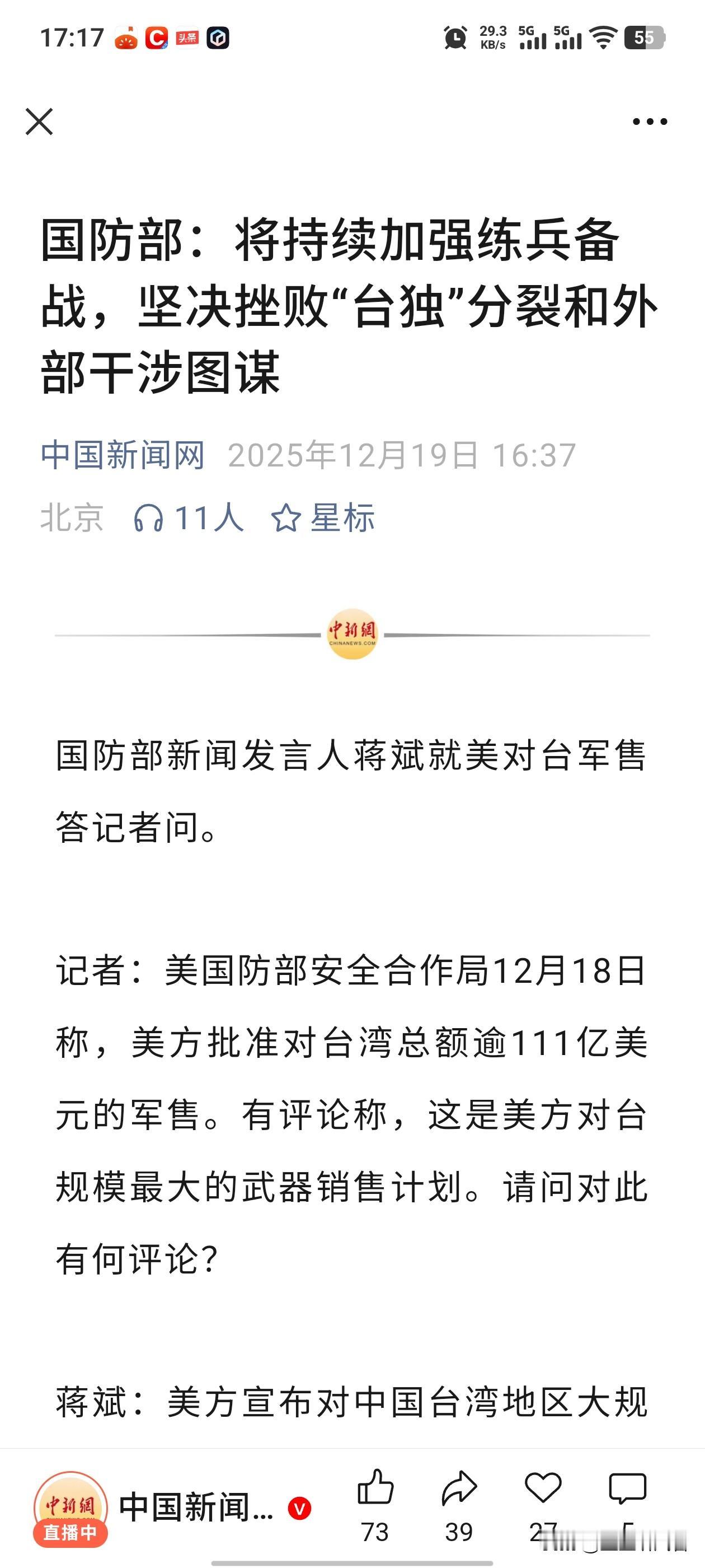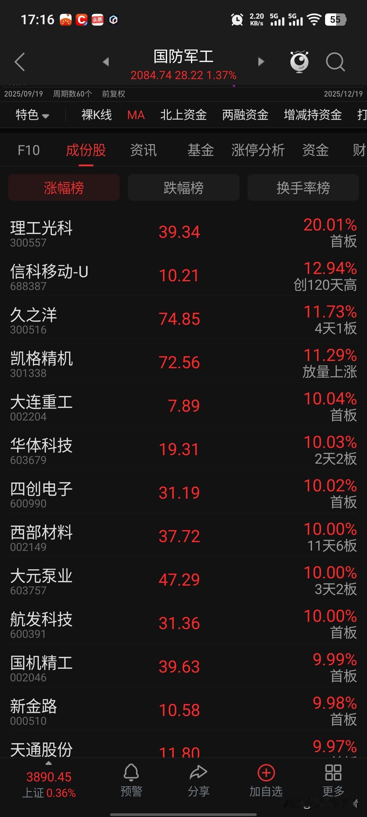 19日收盘,国防军工12股涨停。同日国防部发布申明:继续加强练兵备战,坚决挫败“台独”分裂和外部干涉企图。 事先有消息的资金早早就进入了相关个股。看来下周国防军工板块会持续有行情啊!以上只做个人分析,不作为投资依据。