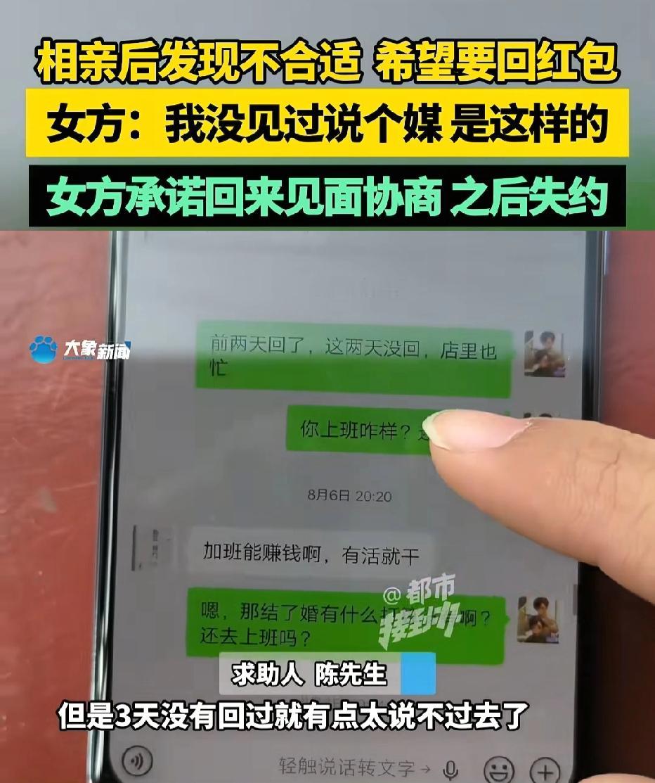 河南许昌,男子去相亲,跟女方见了3次面,在介绍人安排下,给女方4600元见面礼红包。男子以为有戏,问女方住址和电话,想上门去找她,但女方三天才回一条信息,也不给地址和电话。男子觉得相亲不合适,向女方索要红包,但女方却不给,最后还失联。男子无奈,只能求助记者。 陈先生已经过了适婚年龄,他看着身边的人已经结了婚,孩子都二胎了。 他暗自着急,希望早日能找到另一半,早点成家。 陈先生的母亲也为儿子的婚事操碎了心,暗自打听哪里有未婚的姑娘,托人上门求亲。 功夫不负有心人,陈先生通过中间媒人联系到一位介绍人,愿意给陈先生牵线塔桥。 介绍人给陈先生介绍的是附近县的周女士。 但介绍人跟陈先生表示,女方当地习俗,见面必须给2000元红包,以示诚意。 结婚迫切愿望面前,陈先生没有犹豫,依言照做,两人顺利见面并互加了微信。 第二次见面,女方带着媒人去到陈先生家里了解情况。 在介绍人的安排下,陈先生又被包了2000块钱的红包给对方,说这是规矩。 后来陈先生第三次跟女方见面,加上之前的前两次,共花了4600元红包。 陈先生的母亲对这门亲事也很看好,想着女方都带人上自家看了,那咱们也得去对方家看看,合适的话,顺便选个订婚的日子,早点落实结婚事宜。 她催促陈先生多跟周女士聊天培养感情,趁热打铁去女方家。 陈先生本以为,两人能在微信上聊出爱的火花来,他经常给周女士发信息,想上对方家去看看,顺便聊聊订婚的日子。 可惜周女士却爱理不理的,三天才回一条信息。 陈先生也问不到对方的住址和电话,渐渐的,他心里也有些泄气了。 热情被一次次冷落,希望一点点破灭,陈先生终于认清现实,提出结束这段没有进展的相亲,同时要求退还4600元红包。 可周女士的态度却来了个180度大转弯,不仅拒绝退款,还直接失联。无奈之下,陈先生只能求助记者。 陈先生告诉记者,女方态度冷淡,不怎么回复信息。 而中间媒人却表示,女方说她跟男方闹矛盾了。 至于陈先生和周女士有什么矛盾,中间人也不知情。 记者认为陈先生跟女方说法不一样,想拨打女方的电话了解情况,却发现男方也没有对方的电话。 陈先生的母亲拨打了女方母亲的电话,没想到却被拉黑。 在记者的协调下,陈先生的媒人跟女方的媒人通电话提出见面商谈退钱的事。 但女方的媒人却说没时间见面。 在记者的追问下,女方的媒人说,女方只愿意退2000元,是因为男方这边不愿意了。 陈先生的母亲不乐意了,质问那剩下的2000元弄哪里去了,为什么不退。 陈先生无奈解释,他没有愿不愿意,而是女方聊着就不回信息。 最后,女方的媒人表示,陈先生如果要追回4000多元,就去问女方要,不行就去法院。 但陈先生想表示见面沟通。 不过女方的媒人不给这个机会,直接说会叫女方的母亲让她女儿把钱退回去。 最终,记者拨通了周女士的电话,周女士的说法跟陈先生的说法明显不一样。 但周女士表示晚上回去会将陈先生的红包退还。 不过到了晚上,陈先生并没有收到周女士的退钱。 相亲就给红包,也许很多大龄男青年也遭遇这样的事,不过话说回来,相亲不成功,红包确实要退还给人家,谁的钱都不是大风刮来的。 《民法典》相关规定,以维系或发展婚恋关系为前提的大额赠与,应认定为附解除条件的赠与,即双方最终未能缔结婚姻时,赠与所附条件未成就,受赠人应返还相应款项 。 本案中,陈先生与周女士仅见面3次,未建立实质恋爱关系,更未办理结婚登记或共同生活,婚姻目的完全未达成。 周女士继续占有该4600元缺乏法律依据,陈先生有权要求全额返还。 即便该款项不被认定为彩礼,仍可依据附解除条件赠与的法律规则,或不当得利制度,通过法律途径追回款项。 对此,你怎么看?