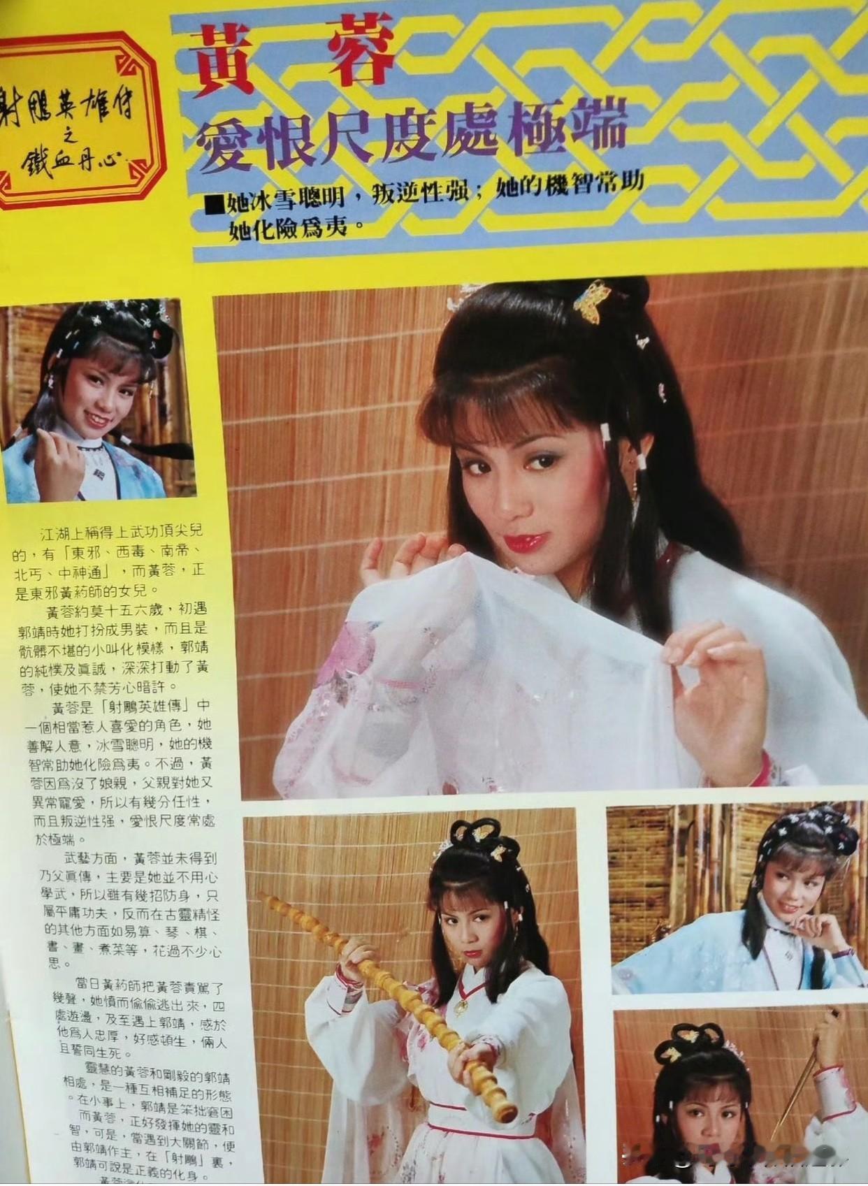 🧡翁美玲旧刊报道~黄蓉 爱恨尺度处极端 她冰雪聪明,叛逆性强;她的机智常助她化险为夷。 江湖上称得上武功顶尖儿的,有「东邪、西毒、南帝、北丐、中神通」,而黄蓉,正是东邪黄药师的女儿。 黄蓉约莫十五六岁,初遇郭靖时她打扮成男装,而且是肮脏不堪的小叫化模样,郭靖的纯厚及真诚,深深打动了黄蓉,使她不禁芳心暗许。 黄蓉是《射雕英雄传》中一个相当惹人喜爱的角色,她善解人意,冰雪聪明,她的机智常助她化险为夷。不过,黄蓉因为没了娘亲,父亲对她又异常宠爱,所以有几分任性,而且叛逆性强,爱恨尺度常处于极端。 武艺方面,黄蓉并未得到乃父真传,主要是她並不用心学武,所以只有幾招防身,只属平庸功夫,反而在古灵精怪的其他方面如算、琴、棋、书、画、煮菜等,花過不少心思。 当日黄药师把黄蓉骂了幾聲,她愤而偷逃出来,四处漂泊,及至遇上郭靖,感於他为人忠厚,好感顿生,情人且誓同生死。 聪慧的黄蓉和刚毅的郭靖相恋,是一种互相补足的形态。在小事上,郭靖是笨拙囫囵,而黄蓉,正好发挥她的聪和智,可當遇上大關節,便由郭靖作主,在《射雕》里,郭靖可说是正义的化身。翁美玲 古装剧黄蓉
