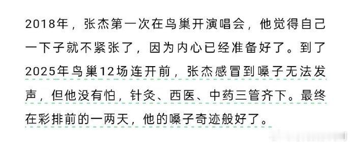 张杰鸟巢12场连开前失声张杰这股拼劲太让人佩服了!失声后中西医三管齐下,硬是扛过来完成鸟巢 12 场连开,太有毅力了。 张杰演唱会前嗓子无法发声