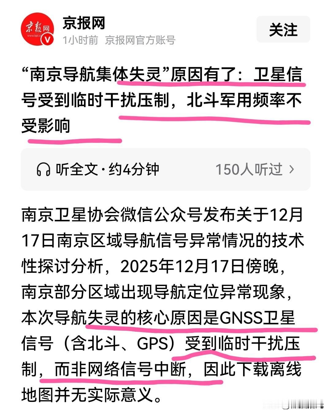 “南京导航集体失灵”原因: 卫星信号受到临时干扰压制,北斗军用频率不受影响。 好在我们北斗卫星系统把军用和民用分开了,否则,后果就严重了! 究竟谁有这么大的胆量,谁有这么大的威力可以让整个南京的导航集体失灵?
