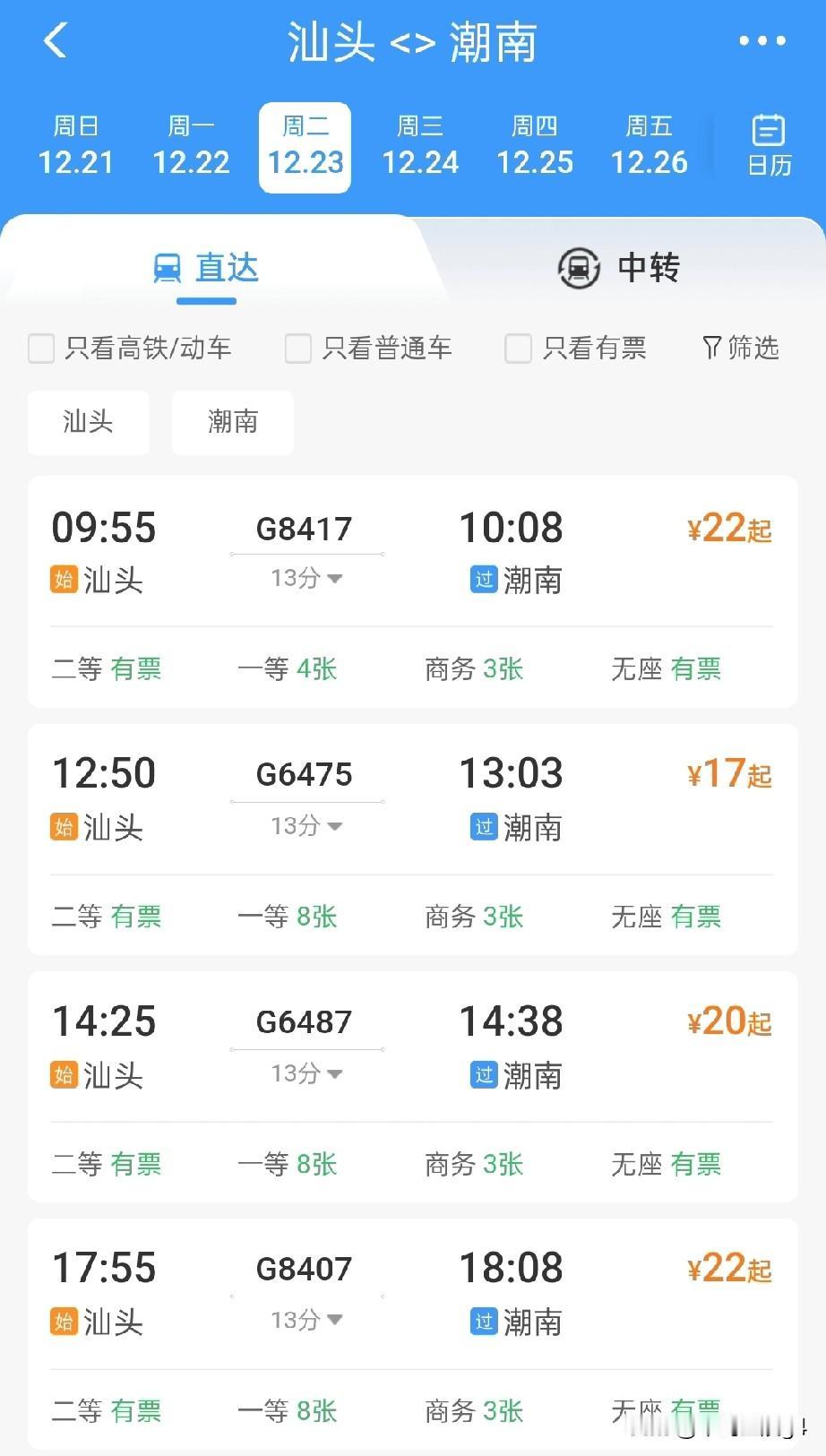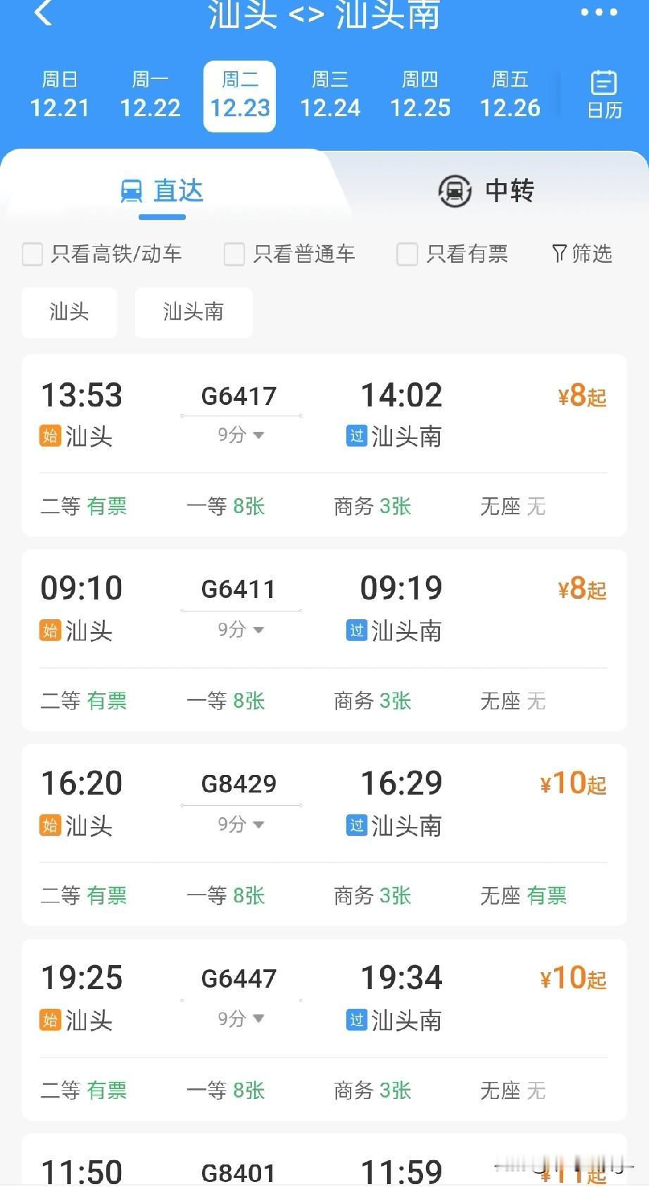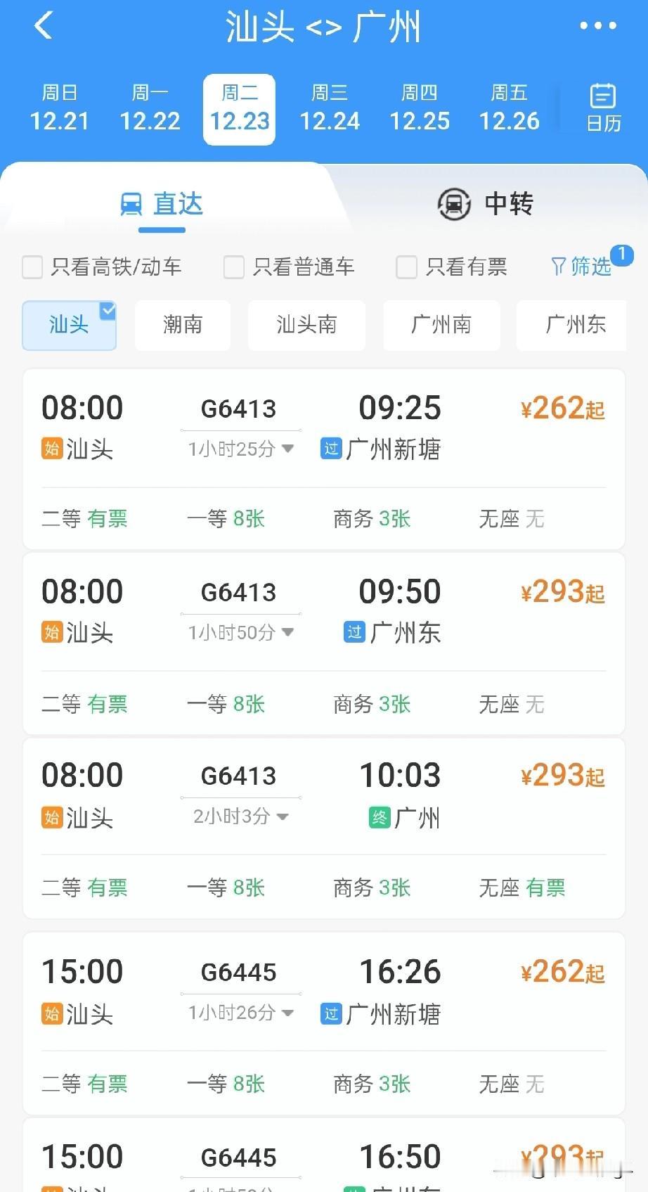 汕头站至汕头南站高铁12月22日开通,初期开行至广州和深圳方向高铁列车 2025年12月22日,广东要开通两条高铁,一条是广湛高铁,另一条则是汕头站至汕头南站的高铁,设计时速均为350公里,分别作为粤东和粤西连接广州省会的重要高铁干线。 汕头站至汕头南站,最快仅需要9分钟,票价8元起,汕头站到潮南站最快仅需要13分钟,这也是汕头市主城区,连接濠江区,潮阳区,潮南区最快的交通方式了。 汕头站到广州的运行时间最快也缩短到了1小时25分,汕头站到广州新塘站1小时25分。大部分车次,汕头站到广州市中心也仅需要约两个小时。 汕头站到深圳的运行时间最快也缩短到一个半小时,汕头站到深圳站,最快仅需要1小时39分,而普通的高铁列车也仅需要两个小时左右。 作为高铁干线的这一路段,不仅仅只开行去往广州和深圳的列车,在调图以后,还将增开更多方向的高铁,满足不同方向的旅客出行。