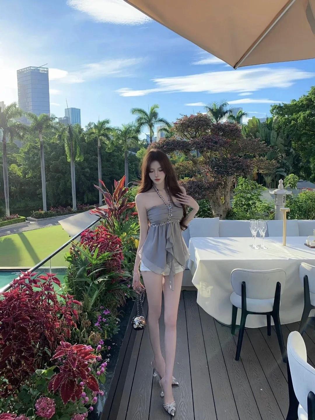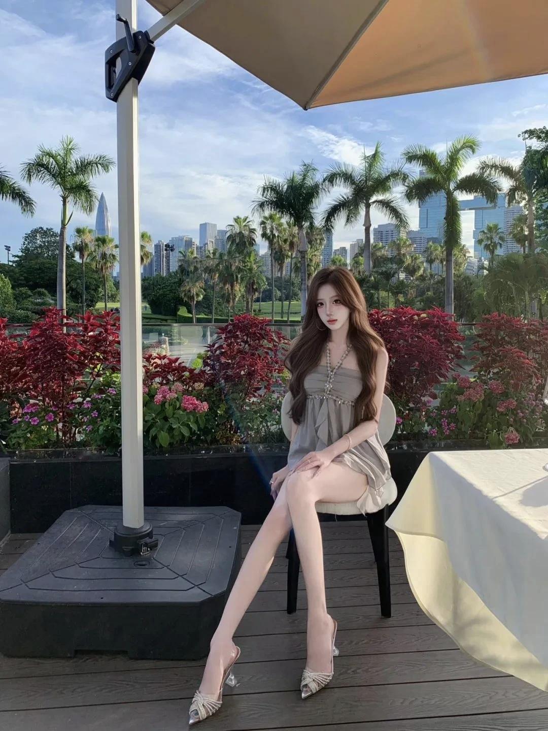 甜美少女风,浅蓝色连衣裙,白色高跟鞋,背景现代感十足。