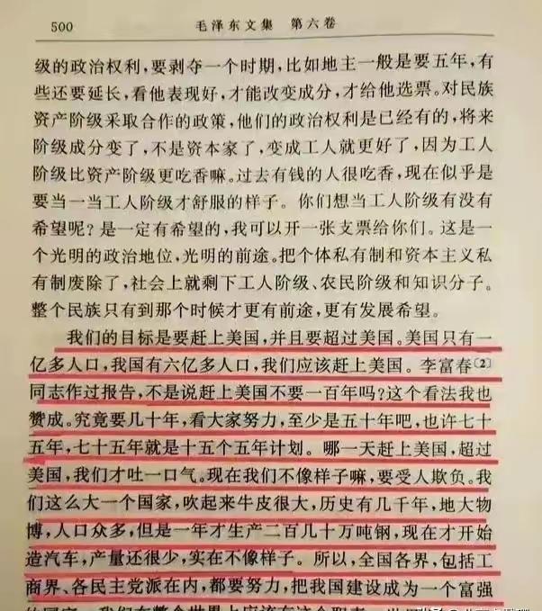 不服不行,伟人就是伟人!难怪老美现在处处找我们麻烦,因为他们真怕了。伟人70多年前就已看透世界,似乎这一切都在他老人家掌握之中,令人赞叹,佩服之极,原来这十五五计划是伟人定好的,看看当时毛主席是如何解释的。 如今我们热火朝天推进的“十五五”规划,并非凭空出现的蓝图,而是毛主席在70多年前就勾勒出的强国路径中的关键一环,这份穿越时空的远见,着实让人拍案叫绝。要知道,1954年的中国还处在“一穷二白”的境地,工业基础薄弱得几乎可以忽略,农民还在靠天吃饭,全国的钢产量甚至不如西方一个中等国家的零头。可就在这样的艰难时局下,毛主席已经站在历史的制高点,为国家的长远发展谋篇布局。 1954年6月,在对《中华人民共和国宪法草案》作说明时,毛主席就明确提出:“我们要建成一个伟大的社会主义国家,大概经过五十年即十个五年计划,就差不多了,就像个样子了,就同现在大不一样了。”这番话在当时听来,或许有人觉得是遥不可及的梦想,但毛主席心里比谁都清楚,建设国家就像跑马拉松,不能急于求成,必须稳扎稳打。到了1955年10月的党的扩大的七届六中全会上,他进一步细化了这个设想,提出“大约在五十年到七十五年的时间内,就是十个五年计划到十五个五年计划的时间内,可能建成一个强大的社会主义国家”。 很多人可能会疑惑,为啥毛主席当时会把时间定得这么长远?其实这正是他的过人之处。他深知建设比革命还要艰苦,革命是团结人民推翻旧政权,而建设是团结人民向自然界作战,是一场更持久、更复杂的“战争”。他曾告诫大家:“可以快一点,但不可能很快,想很快是吹牛皮。” 这种既不盲目乐观也不消极悲观的清醒,让他能客观看待中国的国情——人口多、底子薄、经济落后,要赶上世界先进水平,没有足够的时间沉淀根本不行。 更让人敬佩的是,毛主席不仅规划了长远目标,还早就预判到了发展路上的困难与挑战。他在多个场合提醒全党,要“宁肯把困难想得多一点,因而把时间设想得长一点”,不要把一切都讲得春光明媚,要让大家有充分的思想准备。这种居安思危的意识,成为了我们党带领人民攻坚克难的重要法宝。从“一五”计划奠定工业基础,到“十三五”规划决胜脱贫攻坚,再到如今“十五五”规划聚焦高质量发展,每一步都在印证毛主席的预言,每一个五年计划的完成,都让我们离强大的社会主义国家目标更近一步。 而老美现在处处给我们使绊子,本质上就是怕了这种按部就班、步步为营的发展势头。他们没想到,当年那个被他们轻视的国家,会按照70多年前制定的蓝图,一步步实现逆袭,在科技、经济、军事等领域不断突破。毛主席早就看透了帝国主义的本质,知道他们绝不会坐视中国强大,所以他一直强调要独立自主、自力更生,要建设起巩固的社会主义经济,要有战胜一切困难的信心和决心。 1962年,毛主席在中央工作会议上进一步分析指出:“在我国,要建设起强大的社会主义经济,我估计要花一百多年。” 他还恳切地说,欧洲、美洲花了几个世纪才发展到当时的程度,我们用一个世纪超过就算好了。这种既尊重发展规律又充满自信的判断,让一代又一代中国人有了明确的奋斗方向。如今,我们正处在毛主席预言的“五十到七十五年”关键时期,“十五五”规划的推进,正是在续写这份跨越时空的强国答卷。 从“一五”到“十五五”,七十多年的风雨兼程,我们党始终沿着毛主席等老一辈革命家开辟的道路砥砺前行,用一个又一个五年计划的丰硕成果,证明了伟人远见的正确性。这种一脉相承的战略定力,这种接续奋斗的精神力量,正是中国不断崛起的核心密码。 看到毛主席七十多年前就规划好的强国蓝图正在一步步实现,你有没有被伟人的远见卓识深深震撼?欢迎到评论区分享你的感受!