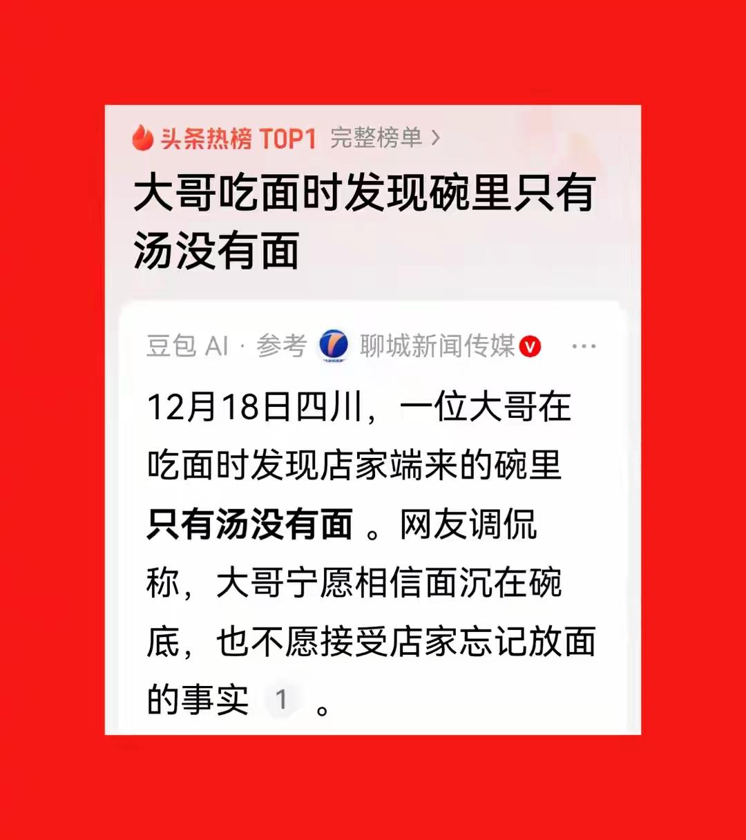 四川,一位大哥在吃面时,发现碗里只有汤没有面 四川,一位大哥在吃面时,突然发现碗里只有汤,没有面。这一幕看似普通,却瞬间点燃了无数人的热议。这不仅仅是一个“碗里没有面”的尴尬瞬间,更像是一面镜子,折射出当下社会的某些微妙变化和人性的复杂。 试想,一个普通的午餐时光,本应是温馨、满足的,但偏偏因为这碗“空碗”引发了如此大的反应。有人会觉得这是小事一桩,随手一扔就过去了;有人则会心生疑问:这是不是餐厅的疏忽?还是有人故意“藏面”在汤里?更深层次的思考,是不是我们在快节奏的生活中,逐渐变得对细节麻木,对“真相”的敏感度降低了? 其实,这个看似简单的事件,折射出的是人们对“真实”的渴望。我们都在追求生活中的“面”,无论是物质的满足,还是精神的慰藉。可当“面”变成“汤”,甚至“没有面”,我们会不会开始质疑这个世界?会不会开始怀疑自己身边的每一个细节?这背后,隐藏着我们对诚信、对真诚的渴望,也揭示了社会中某些“虚假”的存在。 更令人深思的是,这位大哥的反应。有人说,他只是淡然一笑,继续吃汤;有人说,他当场质问,要求店家给个交代。这两种反应,折射出不同的人生态度。有人选择宽容,懂得生活中的不完美;有人选择坚持,追求真相。这两者,哪个才是真正的“勇气”? 其实,社会就像这碗面,有时候表面平静,但暗藏风云。我们每个人都在这场“面与汤”的游戏中扮演着不同的角色。有的人愿意接受“汤里有面”的现实,有的人坚持追求“面”的真相。无论你站在哪一边,都在无声地告诉我们:生活不完美,但我们可以用真诚和坚持,去迎接每一个“空碗”的挑战。 这件事,也许只是生活中的一粒沙,但它提醒我们:不要因为一碗“空面”而失去对生活的热爱和信心。因为,真正的“面”不仅仅在碗里,更在我们心中。只要心怀希望,生活的“汤”也会变得温暖而有味道。 所以,下次当你遇到“空碗”时,不妨想想:这是不是生活在告诉我们,真正的“面”其实早已在我们心里?而我们,是否也该用一颗真诚的心去面对每一次“空碗”的考验?这,才是我们每个人都应该思考的答案。四川面馆 四川人吃面