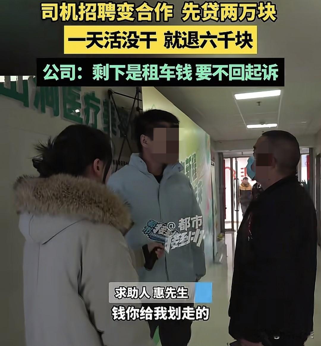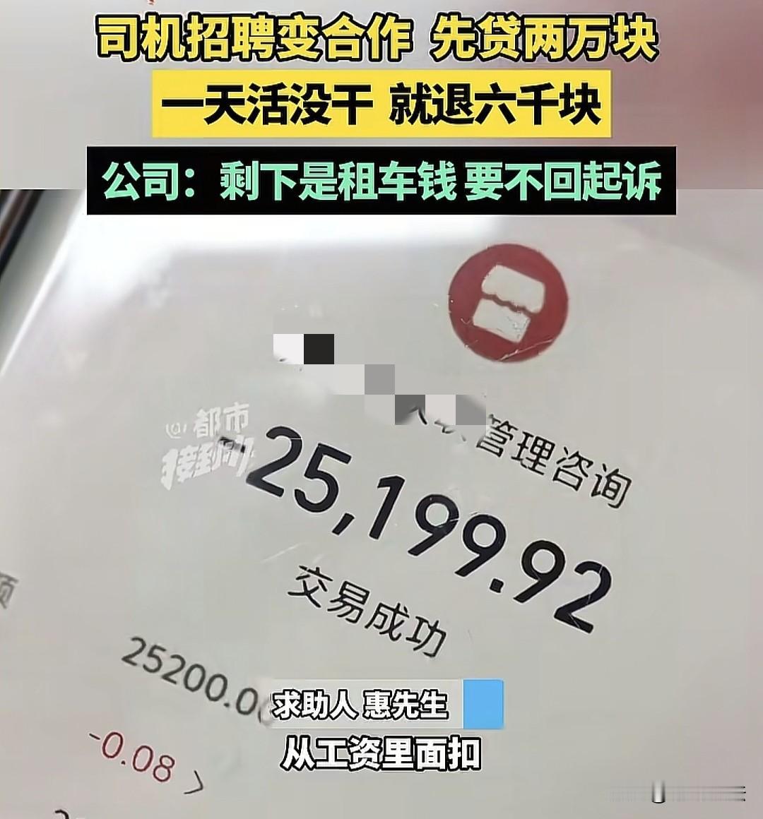 河南郑州,男子头一晚去应聘日结的司机,回家后,他发现对方以看征信的名义从花呗划走25200元,第二天,男子去找公司退车,公司表示:男子一天活没干,只给他退了6900块,说剩下18300元是租车钱,让他找车行要,要不回去起诉。男子火冒三丈指着工作人员大吼:钱就是你给我划走的,我就找你! 12月7日,惠先生在网上看到一招聘司机的广告,说是日结的司机,他不禁有些心动,没多想便前去应聘。 到了某管理咨询公司后,工作人员和惠先生说这个车他得开满三个月,需要签一份协议,交一笔服务费,这笔钱会从后续的工资里面扣。 惠先生只是想应聘个司机,他哪里想到这里面会有一些弯弯绕,没有一丝防备之心,对方说啥他就照做了。 据惠先生回忆,当天办完一切手续后,他就回家了,可回家他发现某管理咨询公司竟然从自己的花呗里划走了25200元。 惠先生恍然大悟,当时办手续时对方工作人员说要看看他的征信,竟然划走了25200元。 12月8号,惠先生找到记者直奔某管理咨询公司要说法,他态度坚决要退车,并要求对方退还相关费用。 惠先生非常生气,质问对方,你用手机划走的,你划到公司了。 工作人员说:“我这么厉害,我给你手机把钱划走了。” 随后,工作人员让惠先生去找车队长要钱去。 惠先生一看对方要把自己支走,顿时火冒三丈,指着工作人员大声说:“钱是你给我划走的,我就找你。” 万万没想到,工作人员对着惠先生骂上了脏话。 双方情绪激动,各执一词,根本无法协商。 既然惠先生的钱被划走了,那得有证据,当时应聘司机也得签合同吧? 可是,惠先生却说,签的协议被对方给收走了。 原来,惠先生在12月7日晚上签的合同,12月8号惠先生突然意识到不对劲,要求退车,可是哪那么容易。 对方给他一份“解约合同”与惠先生解除了合约,但把这协议收走了。 惠先生急着追问对方那25200块钱呢? 对方告诉他,他们会和车行协商要回来。 后来,某管理咨询公司给惠先生出具了一份证明,内容为:“经协商,今退还6900元。”以及备注:“通过双方车行的协商的进度要回18300元。” 惠先生也在上面按了手印。 不过事后,惠先生表示,当时如果不签的话,6900元都不给,一分都没有。 从此之后,惠先生为了要回18300块钱费了九牛二虎之力,却没得到满意的结果。 当着记者面,工作人员表示给惠先生退了6900元,但是和惠先生的合作协议已经解除了。 记者问,当初惠先生通过咨询公司交了多少钱呢? 工作人员说交了25199.92元。 那么惠先生退车是为啥只给退6900元呢? 工作人员表示,因为给惠先生租车交了押金,但对于租车协议在哪呢,工作人员对此根本不回答,直接扭头就走。 惠先生见状追上去指着这名工作人员说:就是你,从我手里看征信把我钱划走的。 工作人员不置可否,却岔开话题说钱交给谁,就找谁要,那就找公司领导要啊。我们也尽量帮他要回,要不回就走法律途径嘛,我们只是个合作关系。 记者问工作人员,合作关系为啥发的招聘信息? 对方有些惊讶,只是说招聘的是合作司机,公司收的是惠先生的服务费,该退的已经退掉了。 惠先生一听勃然大怒,难道25200块全都是服务费吗? 工作人员也不示弱,干脆拿出交钱现场录制视频,里面有人说“上面的服务费是从你那个花呗授权支付给公司,这个清楚吧?” 惠先生回答,“清楚、清楚。” 这25200元是服务费?可工作人员认为,惠先生签了合同后,根本没有做满三个月时间,而且服务费肯定包含租车的。 公司提供的视频中,工作人员说:如果因为个人原因不租的话,这个费用是不会退还的。清楚不清楚? 惠先生回答,清楚。 所以,公司因为惠先生没有做满三个月,违约了,就不退还服务费了。 惠先生真是有嘴说不清,他极力解释说:当时我就说先干两天试试,是你们说没事。你签上吧,到时候不行再退给你。 工作人员一句:“你有视频吗?”直接让惠先生陷入了窘境。 最后,双方情绪过于激动,报了警,要进一步协商。 惠先生也对此很后悔,自己当初太大意了。 此事中,某管理咨询公司在惠先生应聘司机的过程中,故意隐瞒了关键信息,如服务费的具体构成、租车协议的存在等,并诱导惠先生签订了对自身不利的协议诱导他办理贷款,这表明公司存在故意欺骗惠先生的主观心态。 工作人员在查看惠先生征信时,未经其同意,也未说明其用途,擅自划走25200元,并声称这是服务费。 然而,在惠先生要求退车时,公司却以租车押金为由拒绝退还大部分费用,且无法提供租车协议作为证据。 这表明公司存在虚假陈述和隐瞒事实的行为。 惠先生只要能证明对方有欺诈行为,就能请求返还全款。 但是,惠先生作为完全民事行为能力人,明知自己用花呗进行借款,也需要承担部分责任。