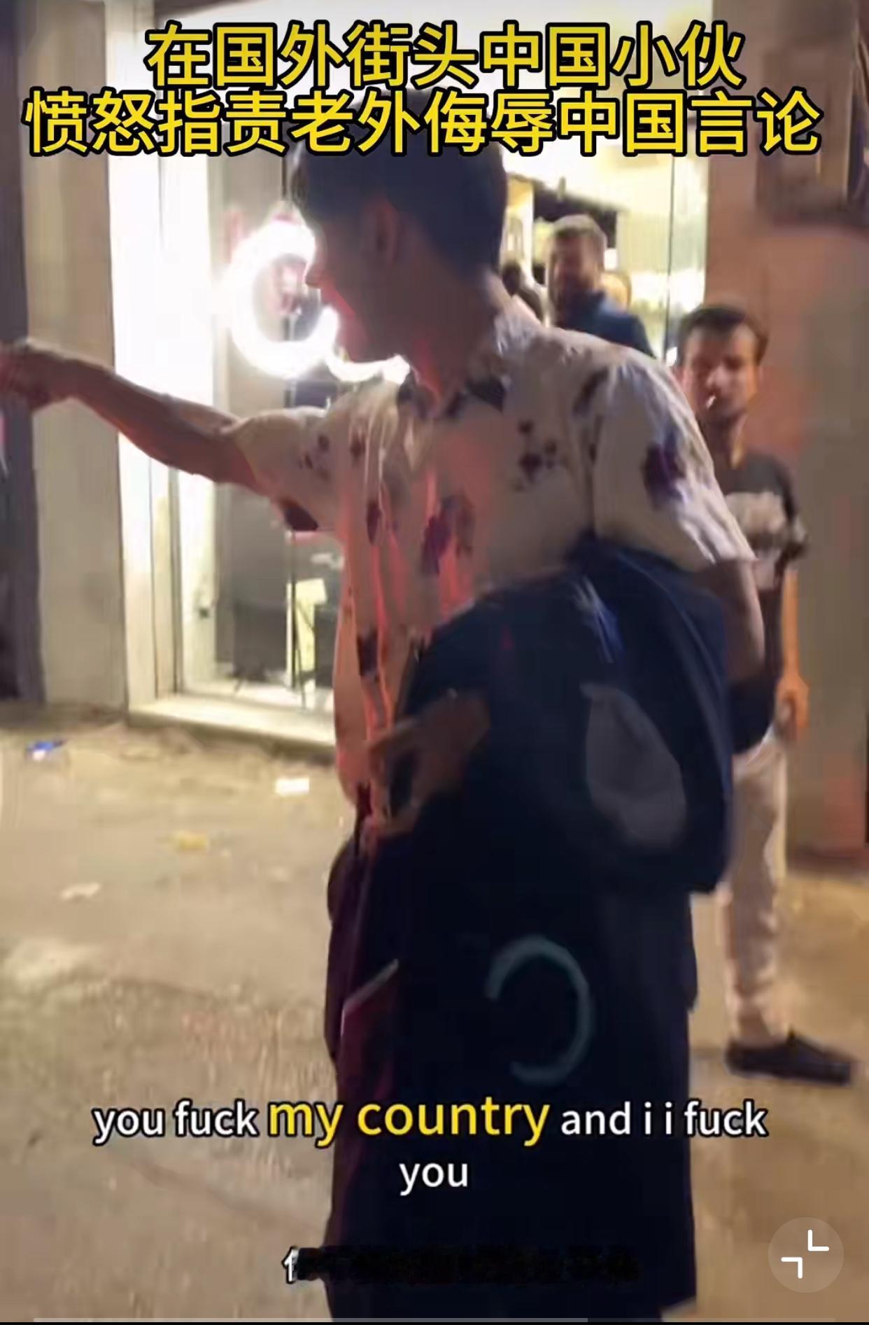 中国纯爷们,好男儿! 近日,一名中国小哥在国外街头,旁边的外国人对他说“秦腔穷”,他上去就指着这名外国人,你说什么呢!你们总统的两个孩子还在中国,我们保护着他们呢,不要再让我听见你的任何声音!再说我就干你! 对比前不久在印度餐厅被辱骂,前者同行人乖乖的坐着,但这哥们就霸气多了[赞] 不过根据他说的两个孩子,是不是在叙利亚…