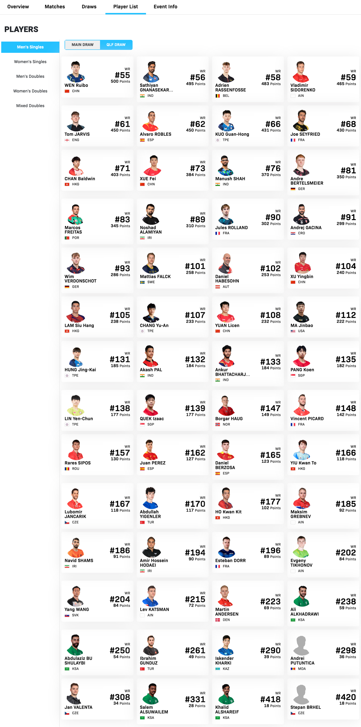 WTT常规挑战赛马斯喀特站1.19-1.24丨男单外协参赛名单【正赛】贝内迪克特·杜达🇩🇪、帕特里克·弗朗西斯卡🇩🇪、卡纳克·贾哈🇺🇸、约纳坦·格罗特🇩🇰、托米斯拉夫·普卡🇭🇷、安东·卡尔伯格🇸🇪、奥玛·阿萨尔🇪🇬、迪博·泊雷特🇫🇷、曼纳弗·维卡诗·塔卡🇮🇳、米洛什·雷德齐姆斯基🇵🇱、黄镇廷🇭🇰、力廉·巴德🇫🇷、理卡多·沃尔瑟🇩🇪【资格赛】沙提安·加纳纳塞卡兰🇮🇳、阿德里安·拉森福斯🇧🇪、瓦拉迪米尔·希德仁科(AIN)、汤姆·贾维斯🏴、阿尔瓦罗·罗伯勒斯🇪🇸、郭冠宏(中国台北)、乔·塞弗里德🇫🇷、陈颢桦🇭🇰、玛纳什·沙🇮🇳、安德烈·贝特斯迈尔🇩🇪、马科斯·弗雷塔斯🇵🇹、诺沙德·阿拉米扬🇮🇷、朱尔斯·罗兰🇫🇷、安德烈·加奇尼🇭🇷、维姆·维尔登斯考特🇩🇪、马蒂亚斯·法尔克🇸🇪、丹尼尔·哈贝松🇦🇹、林兆恒🇭🇰、张佑安(中国台北)、马金宝🇺🇸、洪敬恺(中国台北)、阿卡什·帕尔🇮🇳、安库尔·巴特查尔吉🇮🇳、冯耀恩🇸🇬、林彦均(中国台北)、郭勇🇸🇬、博尔加·豪格🇳🇴、文森特·皮卡德🇫🇷、瑞思·希波斯🇷🇴、胡安·佩雷拉🇪🇸、丹尼尔·贝佐萨🇪🇸、姚钧涛🇭🇰、卢博米尔·扬察里克🇨🇿、阿卜杜拉·伊根勒🇹🇷、何钧杰🇭🇰、马克西姆·格列布涅夫(AIN)、纳维德·沙姆斯🇮🇷、阿米尔·侯赛因·霍代伊🇮🇷、埃斯特班·多尔🇫🇷、叶夫根尼·季霍诺夫(AIN)、汪洋🇸🇰、列夫·卡特斯曼(AIN)、马丁·安德森🇩🇰、阿里·阿尔哈德拉维🇸🇦、阿卜杜勒阿齐兹·卜·舒莱比🇸🇦、易卜拉欣·贡杜兹🇹🇷、伊斯坎德尔·哈吉🇰🇿、安德烈·普图蒂卡🇲🇩、扬·瓦伦塔🇨🇿、塞勒姆·阿苏瓦利姆🇸🇦、哈立德·阿勒肖里夫🇸🇦、斯捷潘·布雷尔🇨🇿