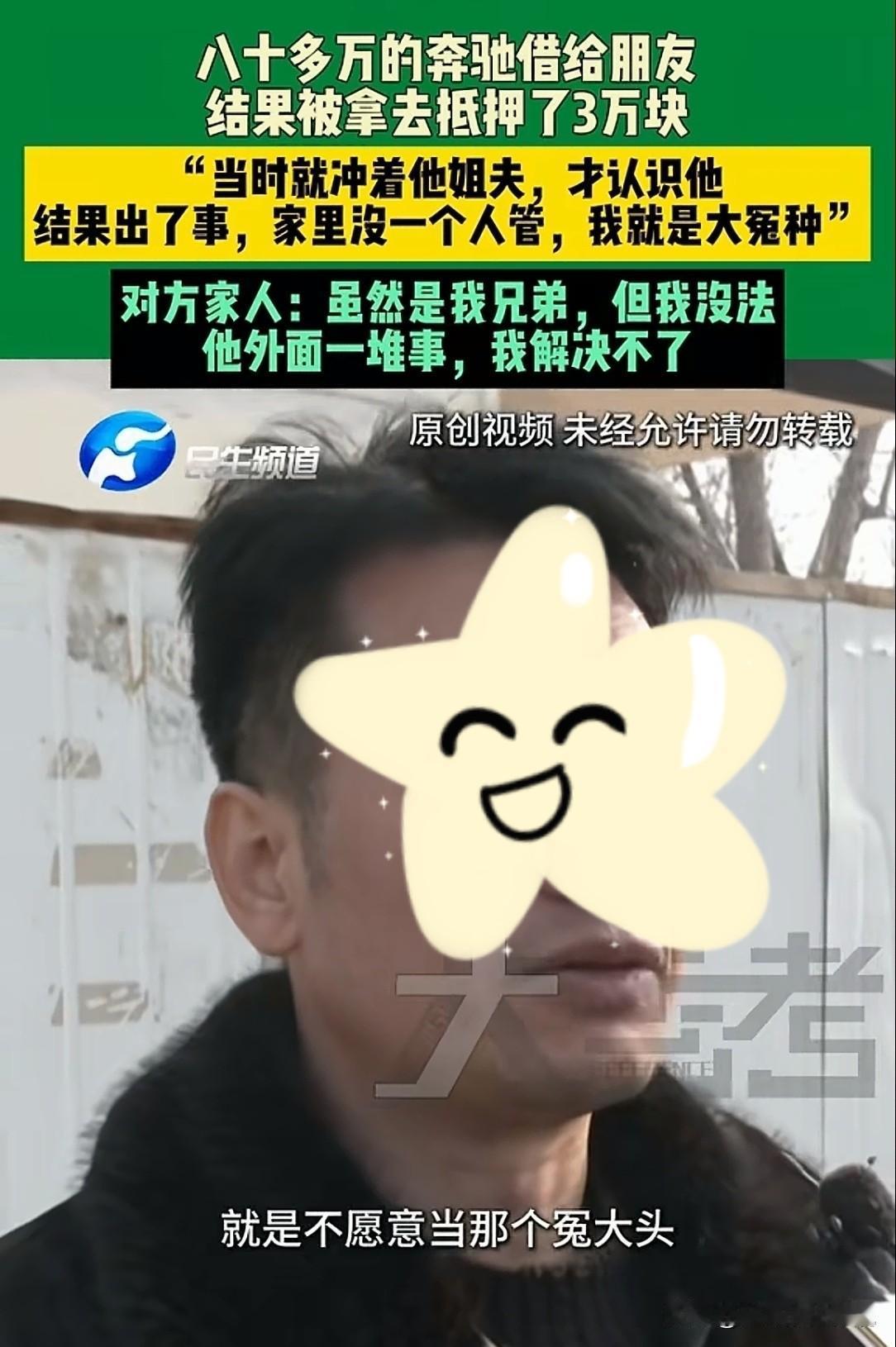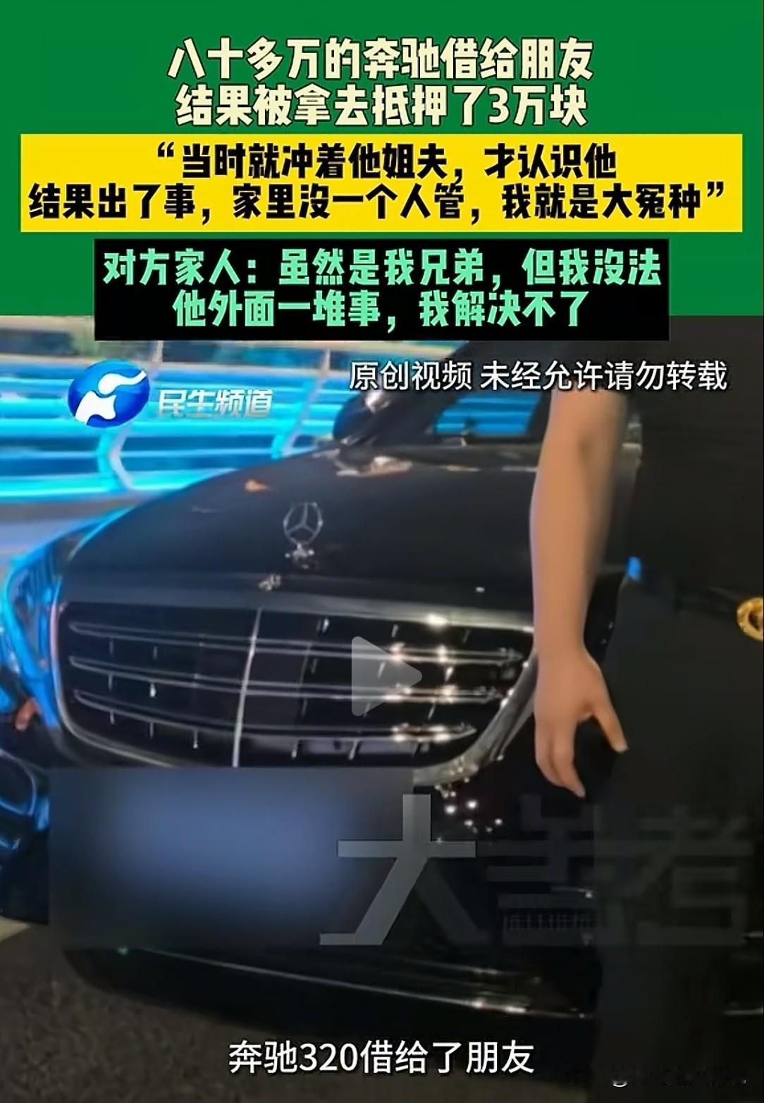 河南郑州,男子有一辆价值80多万的奔驰S320,一朋友死缠烂打,借他的车撑场面去见女友。不料,车借出去8个月都要不回来,他上班只能坐公交,直到他翻脸,朋友才说,把他的车抵押了3万块钱,自己没钱赎不回来了。男子想自己掏3万块钱把车赎回来,得知对方的要求后,男子才明白,自己被坑惨了! 郑先生买了一辆奔驰S320,总价80多万,办的是分期付款,每月还款将近6000。 郑先生豪爽大气,爱交朋友,平时谁有个啥事,他都喜欢帮忙。 可就在8个月前,他帮了朋友一个忙,至今让他后悔不已。 郑先生有个同事,两人处的不错,后来同事的弟弟小陈来公司实习,和郑先生成了好朋友。 今年三月份,小陈找到他说:“哥,你看我都30多岁了,还没个女朋友,我想借你的豪车开一下,去相亲撑个场面。” 郑先生虽然豪爽,但车不外借的道理还是拎得清,直接拒绝了小陈。 可小陈只要看到他,就一直死缠烂打要借他的车。 那天小陈又找到他说:哥,我找个女朋友不容易,就开一下你的车,很快就还回来,你就借我一次吧。 郑先生说,要开车送他,小陈说,你送我见了女朋友,多不好意思。 郑先生只好说,我这车可是七八十万,你可别给我开坏了。 小陈立马保证,我开车你放心,没啥事,就是去见女朋友,很快给你送回来。 郑先生也是被他磨的实在抹不开情面了,只好让他把车开走了。 可他万万没想到,小陈把车开走后,至今都过去了8个多月,郑先生再也没见过自己的这辆车。 开始几天,郑先生联系小陈还车,他只是说再开几天。 郑先生上班只好挤公交,凭空给自己添了很多麻烦。 可一催还车,小陈就今推明,明推今,车就是不还给他。 一个月过去了,车不见人不见,郑先生由每天的催促还车,变成了哀求。 他天天求着小陈,赶紧把车还回来。 小陈一直拖着说,自己觉得开他的车好玩,天天开着呢。 郑先生实在没办法了,就给他急了,小陈和之前一样,就说过几天。 郑先生的家人起了疑心,你这是啥朋友、啥交情? 咱这七八十万的车,让他随便开?几个月都不还回来? 无奈之下,郑先生只好约小陈,让他无论如何得把车还回来,不然就和他翻脸。 小陈一看实在躲不过去了,才跟他说了实话:“哥,这车早不在我手里了。” 原来小陈儿欠了别人的钱还不上,人家找他打官司。 他实在没办法了,就把郑先生的车给抵押了。 郑先生赶紧问:“抵给谁了,抵了多少钱?” 小陈儿只好实话实说,抵押了3万块。 郑先生直接懵了:“我这可是80多万的车,你只抵押了3万块,你到底还有没有点儿谱?” 郑先生的话把小陈都问笑了,要真靠谱,能干出这事? 郑先生这才知道,自己当了个冤大头。 为了尽快拿回自己的车,郑先生只好对小陈说,这3万块钱自己掏了。 让小陈赶紧跟他一块去把车开回来。 可小陈却说,放贷的那人都不是正规的抵押公司,而是私人。 更离谱的是,连个抵押合同都没签,只有一张借条,和一个微信转账记录。 小陈说,当时是同学介绍的,自己又急等着用钱,就没考虑那么多。 小陈和郑先生两人找到押车的人,那人张口就要9万。 不是说好的3万吗?怎么一下子涨了3倍? 小陈这才说了实话,当初抵押车时讲好了赎车日期。 如果到了日期不赎车,每过10天就涨3000块,现在已经涨到9万了。 郑先生直接傻眼!如果3万2万,自己还能替小陈还上。 9万自己也拿不出来,这辆车自己每月还贷都需要将近6000块。 无奈之下,郑先生要报警,对方才降到了8.5万,说这是最低价,再少连车也不让他看。 明明是自己的车,郑先生却为了这辆车伤透了心,他带着记者找到放贷人。 可记者刚开口,那人就说自己只是中间人,啥也不知道。 郑先生怕他把车再开跑了,和小陈两人直接坐到车里。 那人想把郑先生拉下车,一看没拉下来,直接一脚油门,拉着小陈和郑先生跑了,只留下记者在原地。 郑先生的车至今没要回来,他质疑,手续在自己手里,放贷人扣押车辆合法吗? 《民法典》第311条:无处分权人将不动产或者动产转让给受让人的,所有权人有权追回。 小陈未经郑先生同意,将车辆抵押给私人放贷人,属于无权处分。 郑先生作为所有权人有权直接要求追回车辆。 《民法典》第400条:设立抵押权,当事人应当采用书面形式订立抵押合同。 小陈与放贷人,仅口头约定抵押,未签订书面合同,违反上述条款中,关于抵押合同形式的强制性规定。 根据法律规定,未签订书面合同的抵押行为无效,放贷人无权依据无效合同,主张车辆抵押权。 而且,放贷人要求从3万元,涨至8.5万元,涉及高额违约金。 根据及相关司法解释,民间借贷利率不得超过LPR的4倍。 而目前的利率约15.4%,超出部分不受法律保护。 郑先生可拒绝支付违法利息,仅需偿还本金及合法利息。 目前,郑先生和小陈正在想办法把车赎回来。