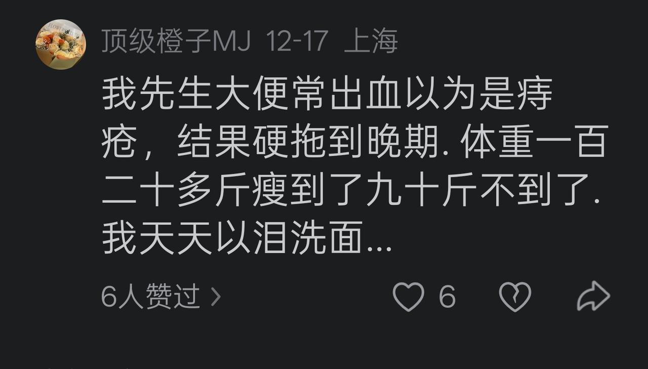 今天一位朋友跟我说,她娘家兄弟大便出血有一段时间了,没去医院检查,自己买了治疗痔疮的药用着。 最近几天,因为被狗咬伤了,才去医院检查,顺便看了一下大便出血的问题。一检查说是直肠癌。而且癌细胞已经扩散,要是早一个月能来,都还有希望。现在只能去上一级医院检查。 家里人一下子哭的昏天暗地。媳妇说,早就知道这情况,一直舍不得去医院检查,害怕花钱,也怕耽误工作少挣钱。现在肠子都悔青了! 他把情况发到网上,很多网友感慨无限,评论不断。我看了一下,大多数网友有一个共同特点,都是身体有了状况,不会第一时间去医院检查,都是先拖着。这种拖着的,大有人在! 这种拖着的原因是什么呢?我想每一个人都有这种拖着的想法,或多或少而已。 并不是对自己的身体不重视,并不是不着急,更多的应该是一种心理感受的问题。 怕有大病,害怕遇到自己的身上,侥幸的想法,不去检查就不确诊,不确诊就还有希望。总以为大病不会找到自己。 怕麻烦,毕竟去了医院各种等待,各种检查,这种诊断,费人又费时间。 怕花钱,毕竟是没有钱。挣钱不容易,可是去了医院,花钱就像流水一样,控不住。 各位朋友,遇到自己身体出毛病了,你的第一反应是什么,你会怎么做?是去大医院仔细检查,还是拖着一段时间再说? 但是我还是得跟大家说,身体有非正常情况,赶快去大医院确诊一下。抓住黄金时间治疗,是最经济的选择方案。千万千万别拖着! 小钱不花花大钱,大钱花了还未必有效果! 欢迎有心理学方面的转了,帮我分析一下,有大病情老拖着,是一种什么样的心理? 痔疮 直肠癌 拖延症