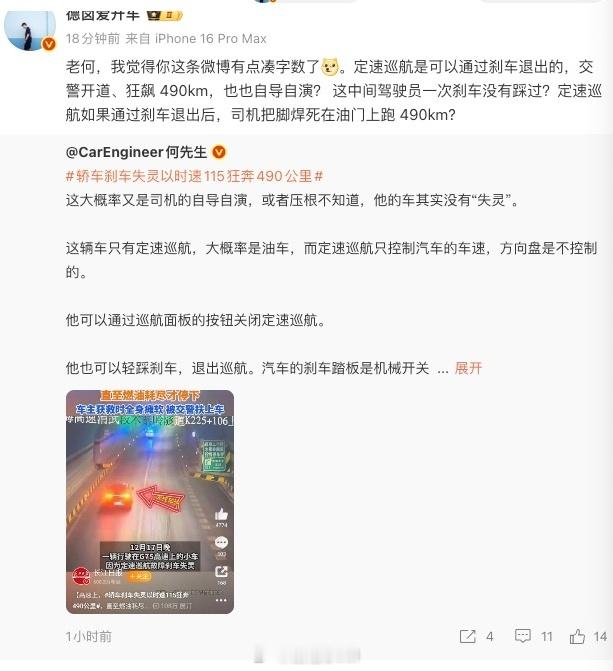 轿车刹车失灵以时速115狂奔490公里定速巡航下,汽车刹车失灵,导致一直没办法停下。到底能不能靠踩刹车推出巡航,使得汽车恢复呢?我觉得这个逻辑是有问题的。本质来说,即便退出巡航了,这时候汽车亦然还是刹车失灵,还是解决不了问题的。在真正的刹车失灵场景中,通常会出现两种情况:第一种:机械或者液压层面的制动失效制动液大量泄漏、真空助力完全丧失、主缸或执行机构失效。这时候你踩刹车,踏板行程异常、变硬或踩到底,制动力并没有建立,巡航有没有退出不重要了。因为你已经没有减速能力了。第二种:信号存在,但制动力不足真空助力不足但未完全消失,电控制动系统进入降级模式,线控制动出现执行异常。在这种情况下,踏板信号可能还能被 ECU 识别,巡航系统有可能会退出,但车依然停不下来,或者减速极其有限。