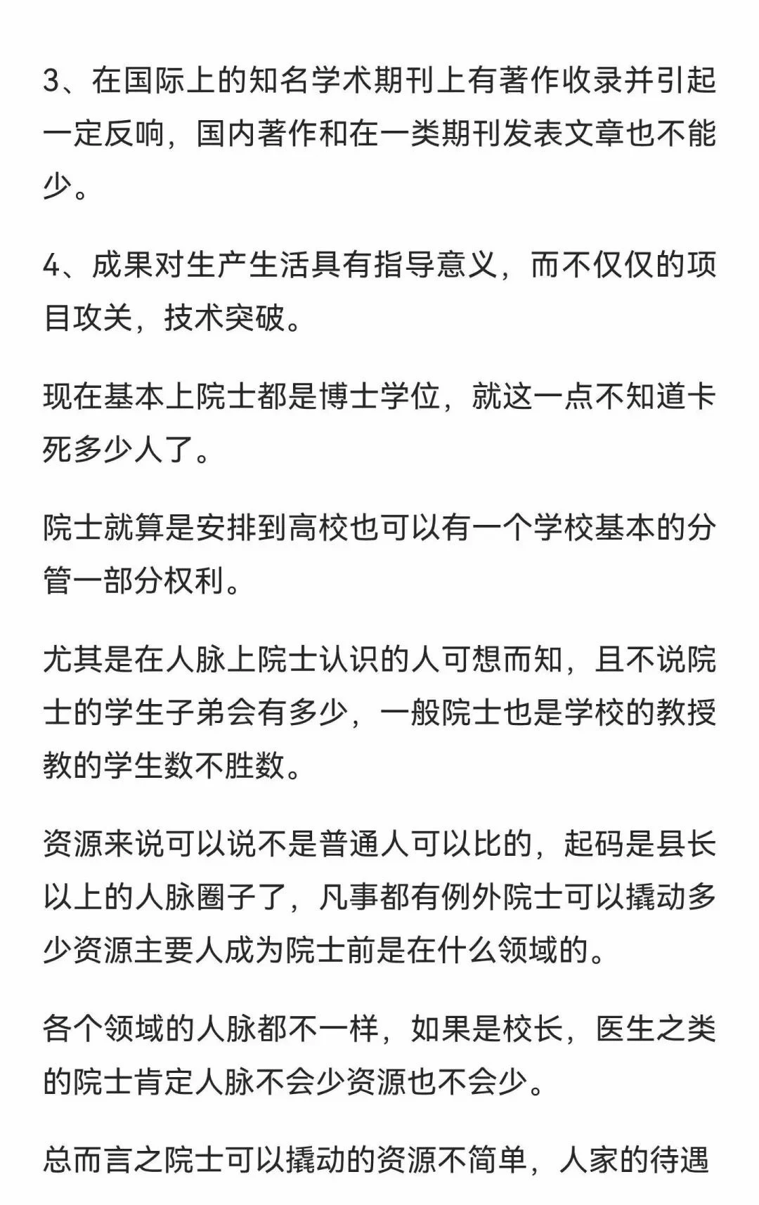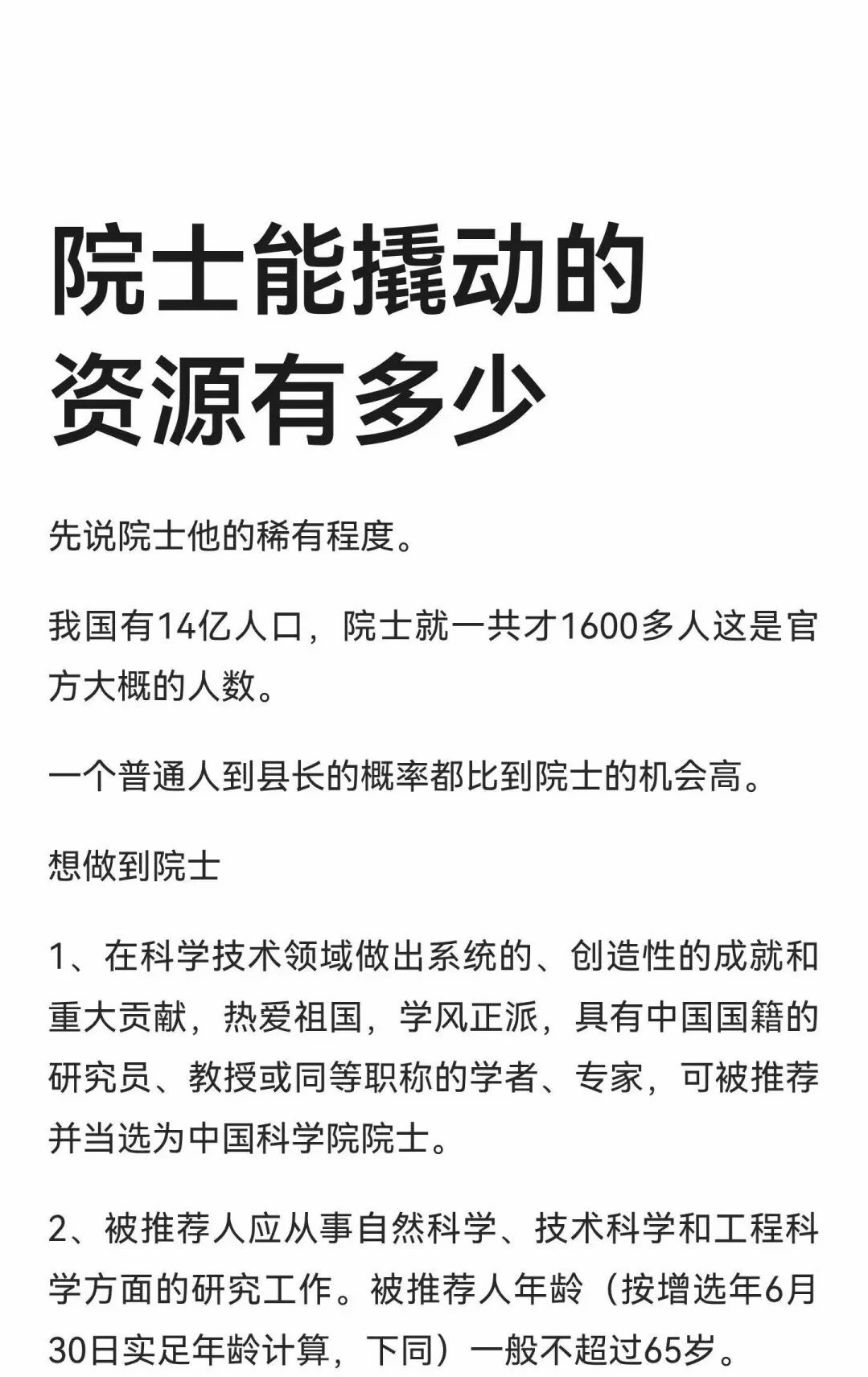 院士能撬动的资源有多少 先说院士他的稀有程度。 我国有14亿人口,院士就一共才1600多人这是官方大概的人数。 一个普通人到县长的概率都比到院士的机会高。 想做到院士 1、在科学技术领域做出系统的、创造性的成就和重大贡献,热爱祖国,学风正派,具有中国国籍的研究员、教授或同等职称的学者、专家,可被推荐并当选为中国科学院院士。 2、被推荐人应从事自然科学、技术科学和工程科学方面的研究工作。被推荐人年龄(按增选年6月30日实足年龄计算,下同)一般不超过65岁。