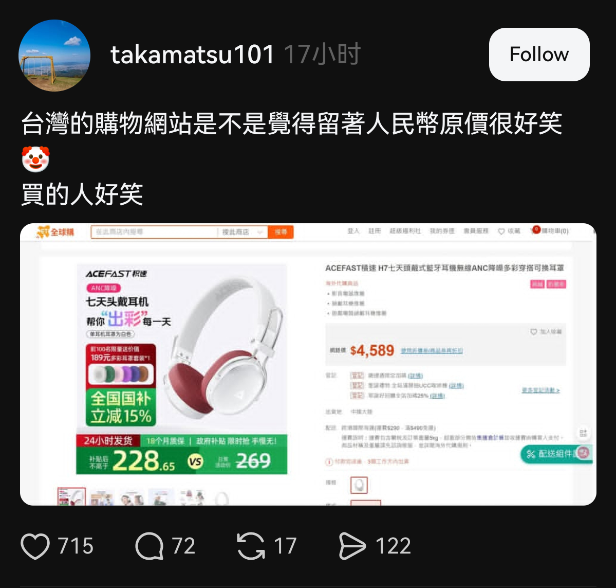 当台湾人发现,卖到台湾约1000人民币的耳机,图片上还标着淘宝的原价