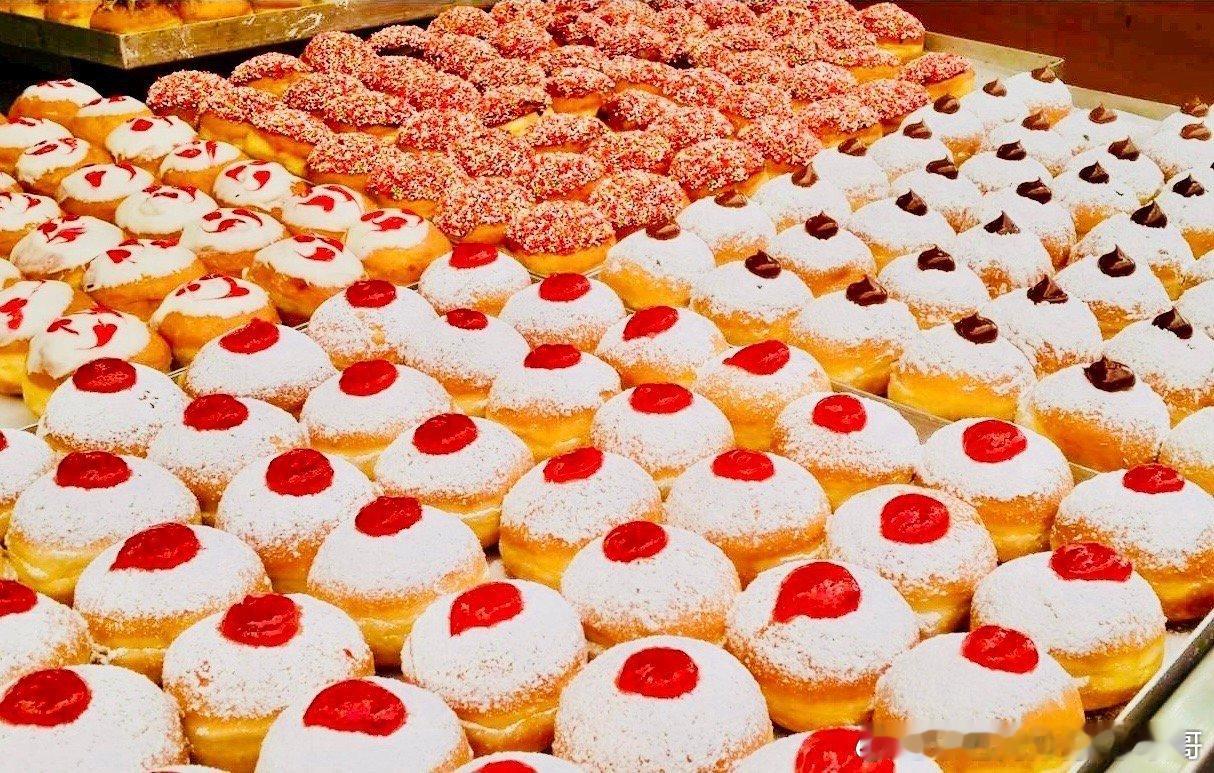 土豆饼与多纳圈如今是全球犹太人的光明节。每天点蜡烛纪念耶路撒冷圣殿油灯常燃,所以节日习俗就是吃油多的食品。海外新鲜事 犹太人在节日最常吃的是炸土豆饼。100来年前,犹太工会为了增加员工收入,大力推广炸多纳圈代替家庭自己炸的土豆饼,鼓励大家外卖赚钱,最终变了花样的多纳圈炸面包成为光明节第一大食品,迄今也成了传统。后来以色列人开发出各种各样的炸面包出售,超脱了过去那种果酱口味的传统风格。如今的炸面包有丰富多彩的馅料,既拉动了经济,也丰富了节日的餐桌。