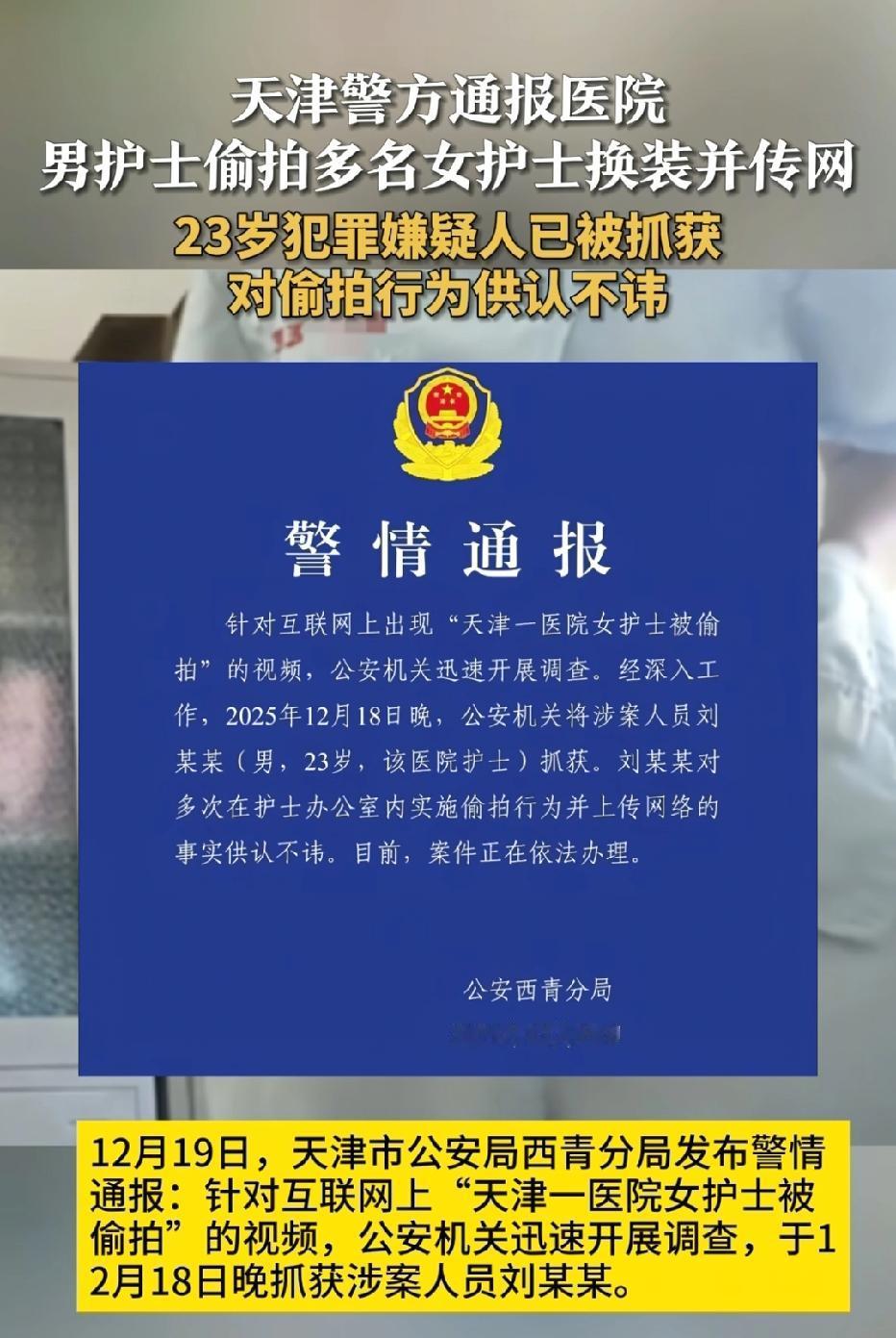 天津,23岁男护士上班时,在护士办公室安装摄像头,多次对女护士偷拍,由于没人发现,男护士胆子更大了,又在更衣室对女护士更衣进行偷拍,还上转到网上,直到女护士发现,气得当场报警,男护士的结局令人舒适。 23岁的刘某某是某家医院一名男护士。 在大众的固有印象里,护士岗位多由女性撑起,男护士的身影本就少见。 刘某某的这份职业,本该让他更懂得医患之间、同事之间的尊重与边界。 可谁也没料到,这份需要时刻恪守职业操守的工作,在刘某眼中却成了满足私欲的便利条件。 护士办公室是科室最忙碌的地方,刘某某想记录下来,他悄悄买了一个摄像头,每天记录这着工作的事。 但他未经大家允许,就偷拍人家,他的行为已经侵犯到了女护士们的合法权益。 可刘某某乐此不疲。 几天过去,见无人察觉,他的胆子越来越大,贪婪的目光盯上了更私密的场所,女护士更衣室。 更衣室并没有男女之分。所以刘某某趁着便利,偷偷在角落安装了摄像头。 女护士们在更衣室更衣换装,本是绝对私密的空间,却被刘某的摄像头无情窥探。 更令人发指的是,他并未满足于私下偷窥,反而将偷拍到的私密画面上传至网络,任由这些内容在不明人士的手中传播、发酵。 纸终究包不住火。一位女护士偶然间发现了摄像头,瞬间如遭雷击。 她愤怒、羞耻、恐惧的情绪涌上心头,女更衣室怎么会有这个东西! 她没有丝毫犹豫,当场选择了报警。 警方介入后,迅速展开调查,顺着网络痕迹和现场勘查,很快锁定了嫌疑人刘某。 面对确凿的证据,刘某无从抵赖,只能低头认罪。 他以为神不知鬼不觉,不过是自欺欺人他肆意践踏他人隐私的行为,也终将受到法律的严惩。 女护士们对刘某某的行为感到无比愤怒和强烈谴责! 有人说,刘某某的结局是咎由自取,任何人的隐私不容侵犯,任何试图挑战法律和道德底线的行为,终将付出沉重代价。 《民法典》第1032条规定,自然人的隐私权受法律严格保护,任何组织或个人不得非法拍摄、窥视他人私密空间、私密活动、私密部位。 刘某某的偷拍及传播行为,严重侵犯了女护士们的隐私权、人格尊严,需承担停止侵害、消除影响、赔礼道歉等民事责任,同时还需赔偿女护士们因精神损害造成的损失 。 同时,刘某某偷窥、偷拍他人隐私并散布的行为,即便未达到刑事立案标准,也需接受行政处罚,可处五日以下拘留或者五百元以下罚款。 情节较重的,处五日以上十日以下拘留,可以并处五百元以下罚款。 若其使用的是非法窃照专用器材,还可另行依据相关条款加重处罚 。 对此,你怎么看?