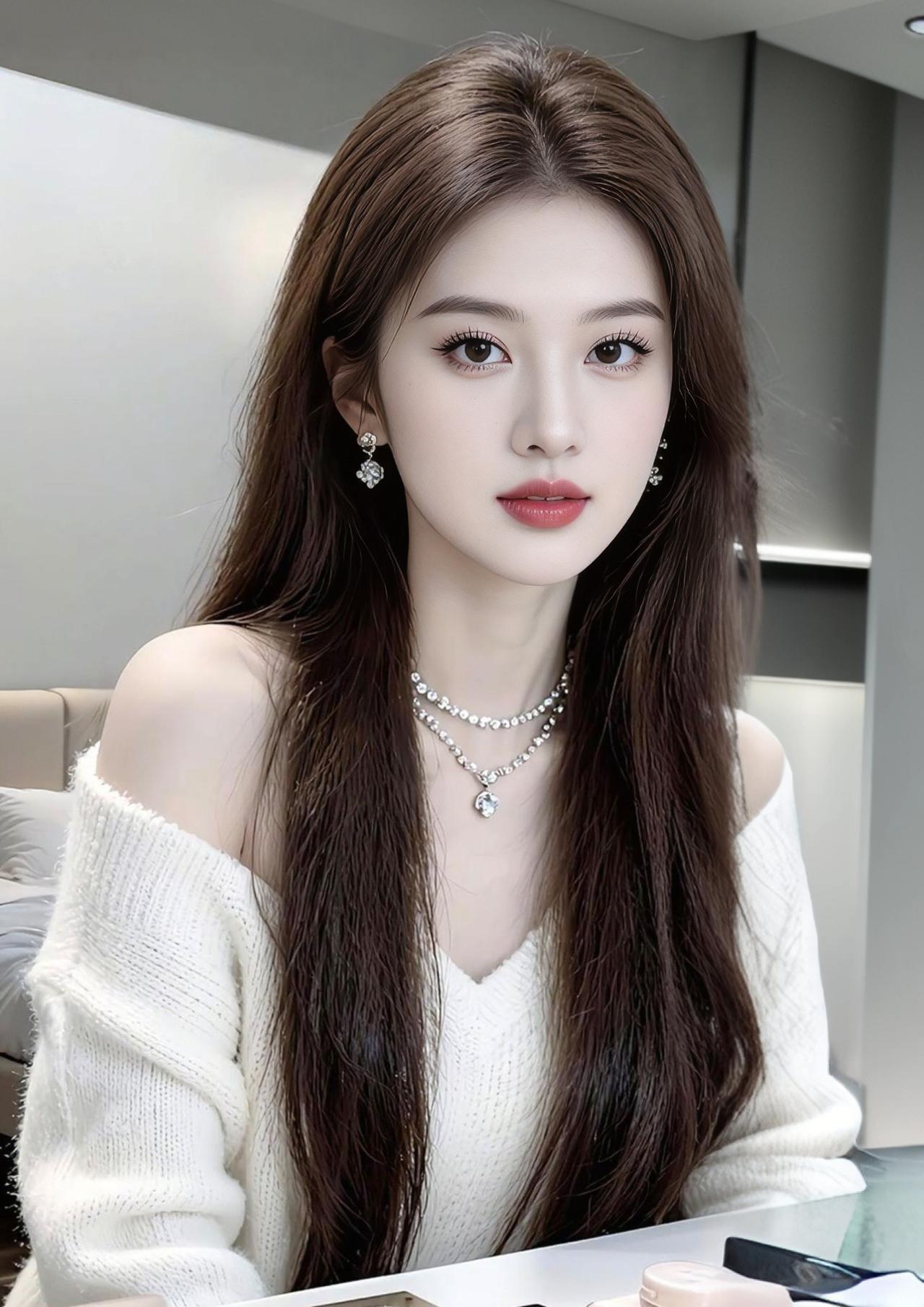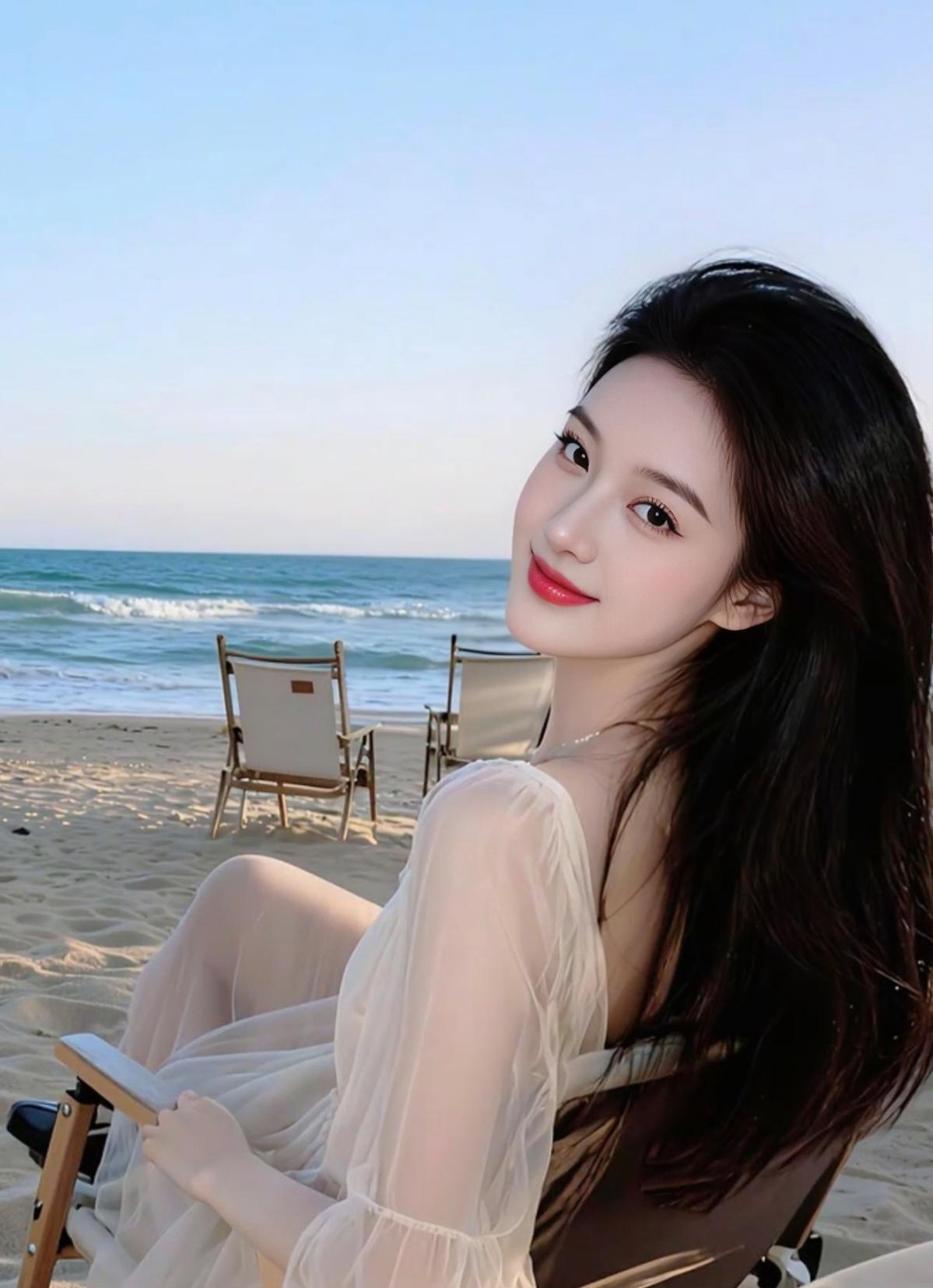 优雅白裙少女,静坐溪流旁,珍珠耳环闪耀,自然美如画。