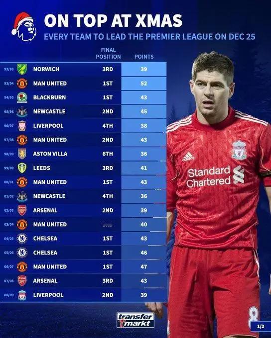 德转盘点了各英超赛季半程冠军(截止到12月25日)积分以及赛季末名次。在英超历史上,33次圣诞节当天排名榜首的球队中,只有17支最终捧起了联赛冠军奖杯。这意味着,圣诞领头羊夺冠的成功率仅略高于五成,并非决定性因素。本季的阿森纳和曼城依然有机会在圣诞节前登上积分榜榜首。最近两次半程冠军最终夺冠的球队分别是上赛季的利物浦和21/22赛季的曼城,而22/23以及23/24赛季的半程冠军阿森纳最终都无缘冠军排名第二。