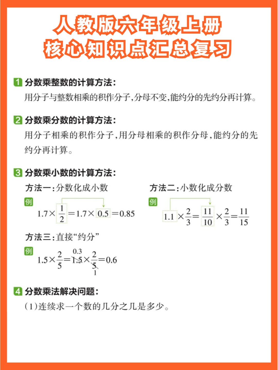 [一R]分数乘法:分数乘整数求相同加数和,乘分数求一个数的几分之几。计算先约分再按法则算。解决 “求一个数的几分之几是多少” 问题,找准单位 “1”。