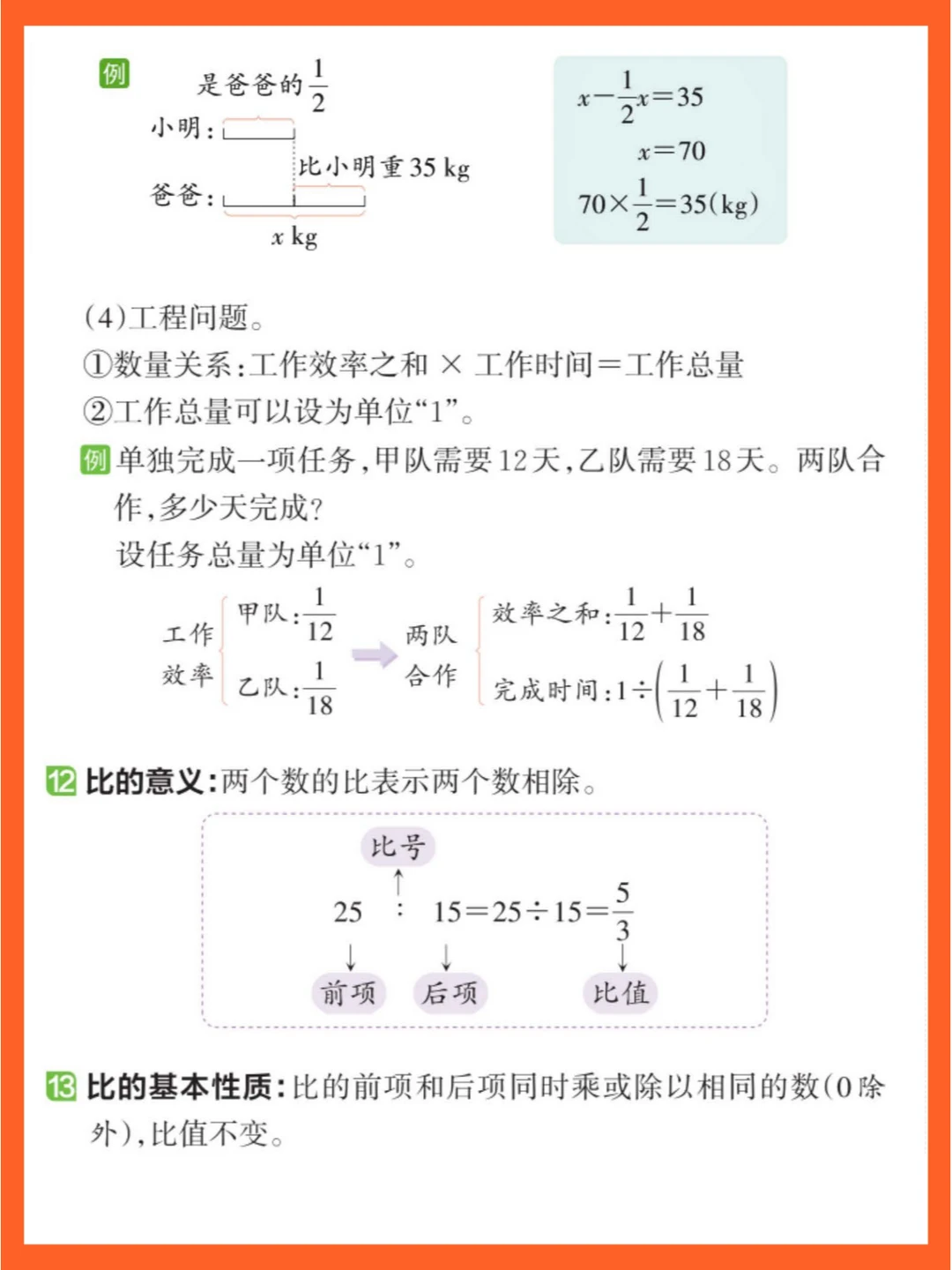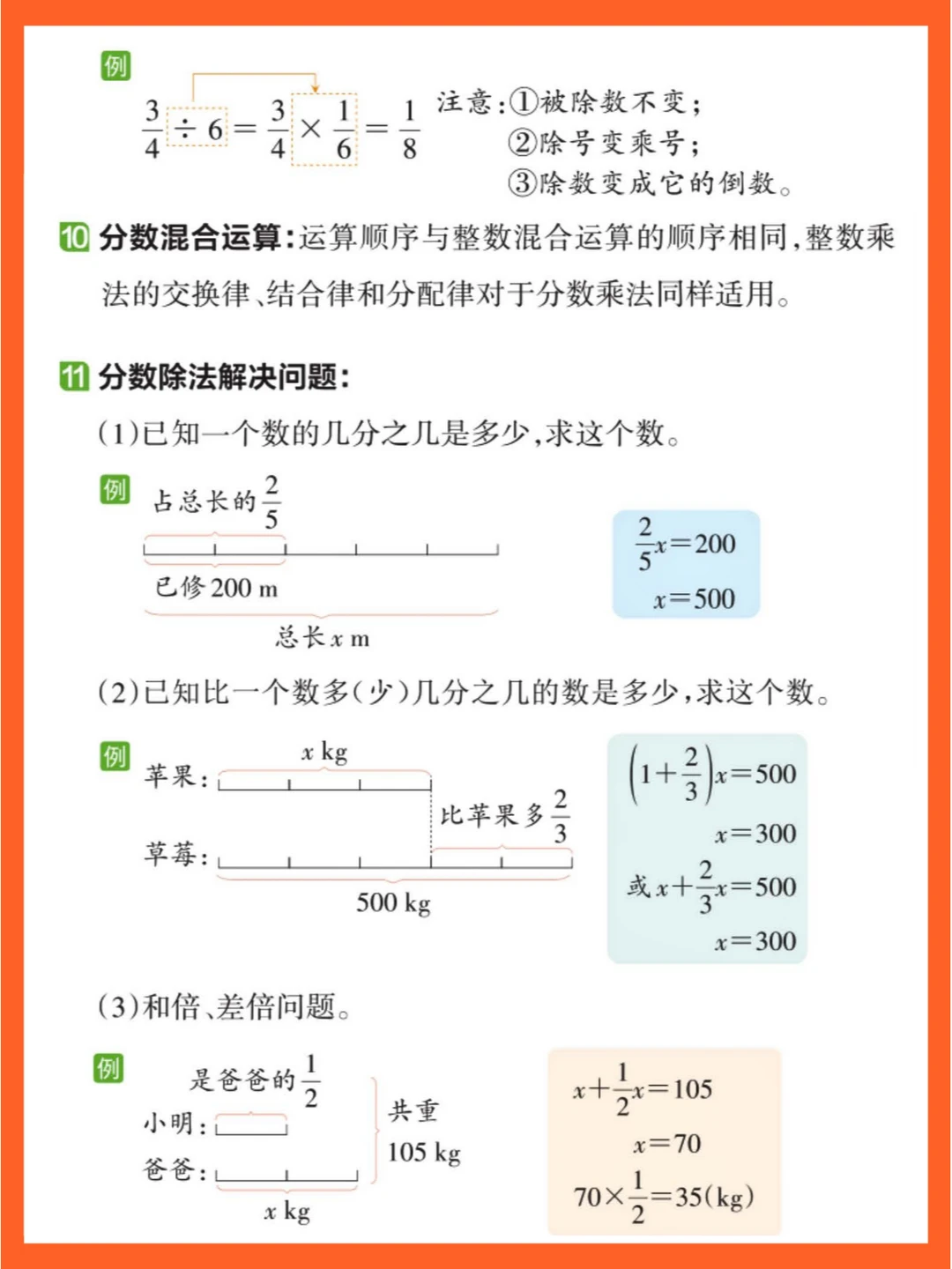 [二R]分数除法:意义同整数除法。除以分数等于乘其倒数。解决 “已知一个数的几分之几是多少,求这个数” 问题,关键在分析数量关系与确定单位 “1”。