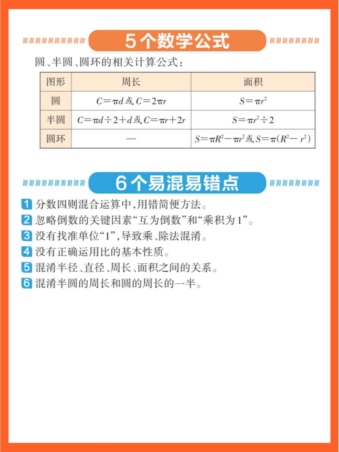 [二R]圆:认识圆心、半径、直径及其关系。熟记圆周长公式和面积公式,理解推导过程。会计算圆环面积