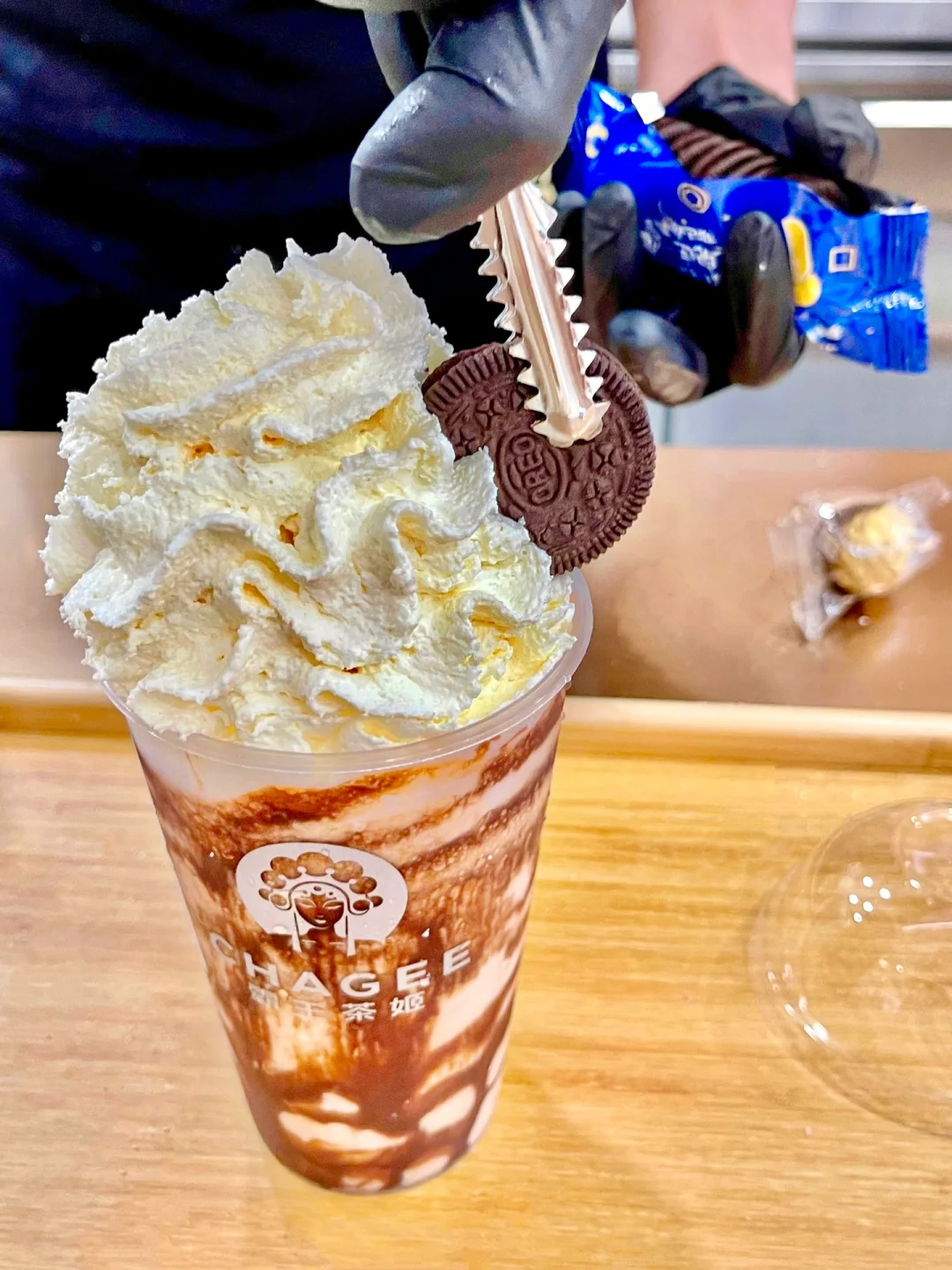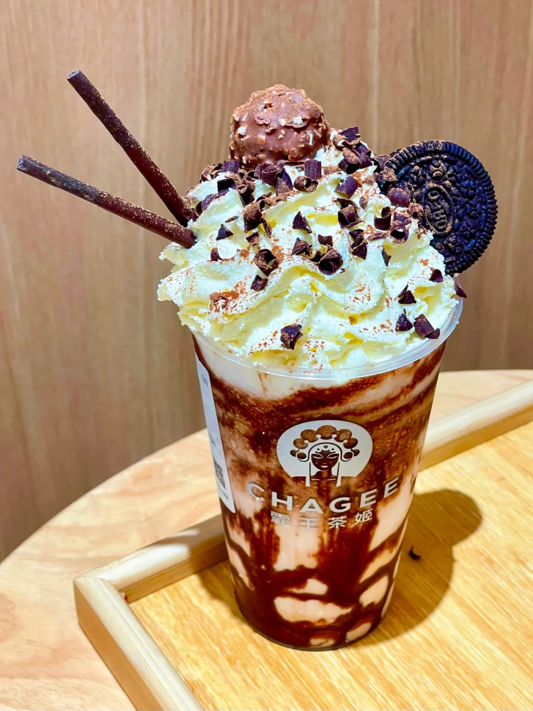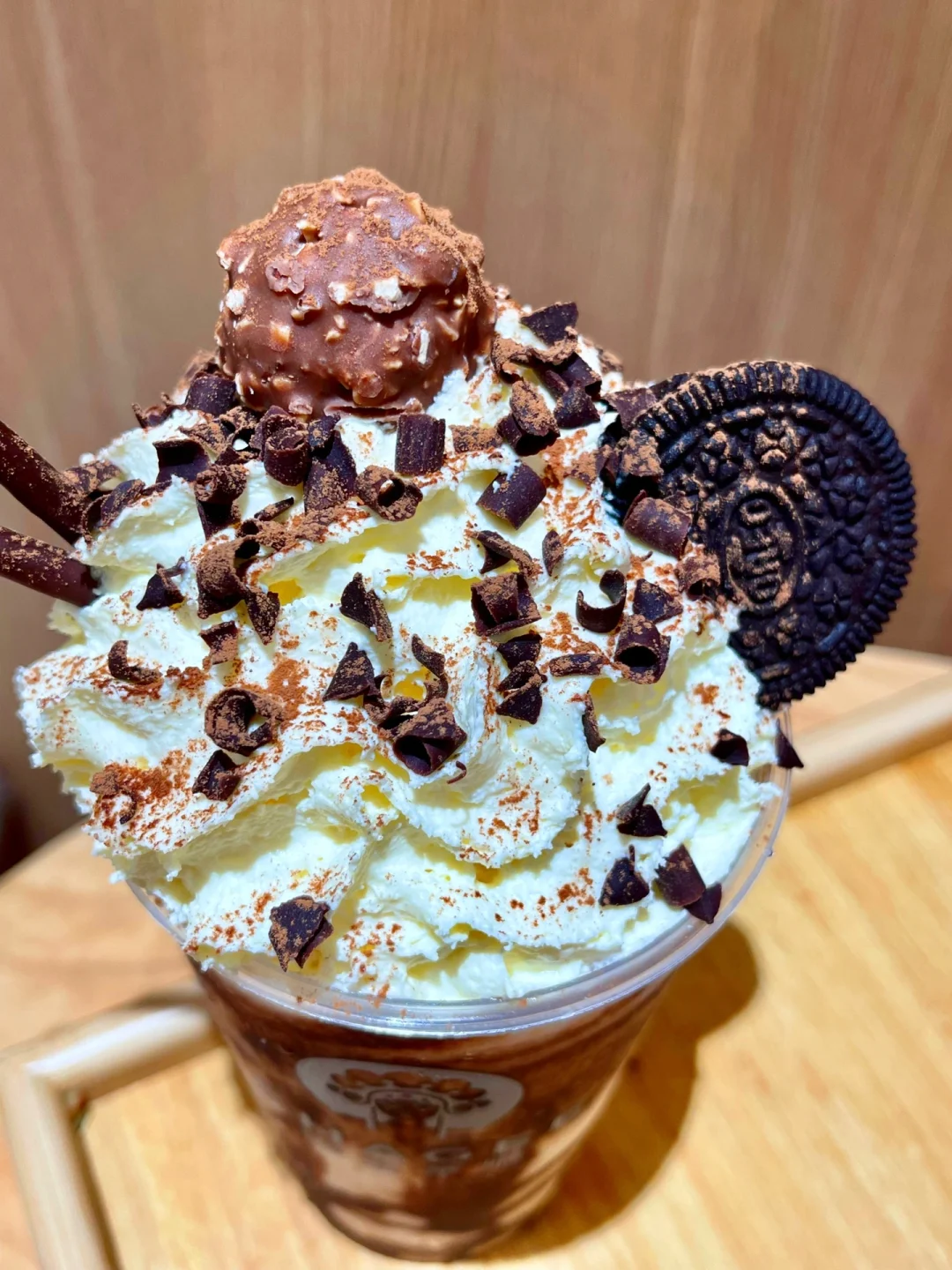 🍫乌山巧克力:巧克力控必点,超量级的热量炸弹,一整颗费列罗巧克里、奥利奥小饼干和巧克力棒铺在雪顶奶盖上,吃完顶部的佐料,再喝一口乌龙茶真的人间值得了。▫️