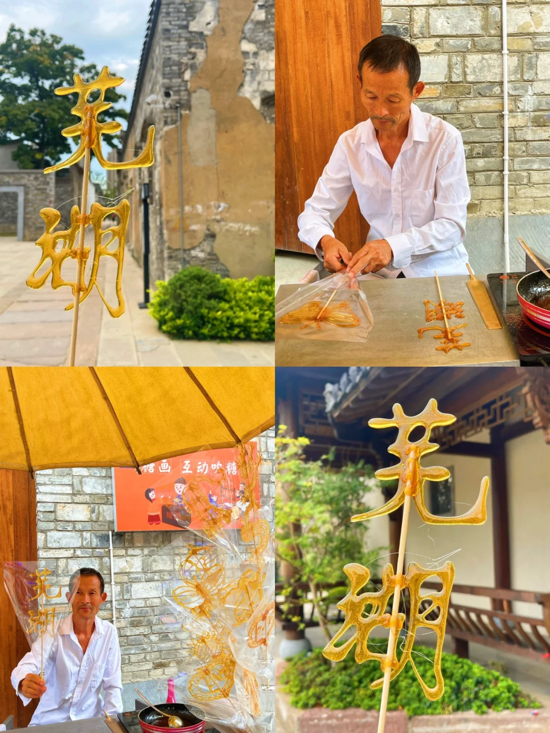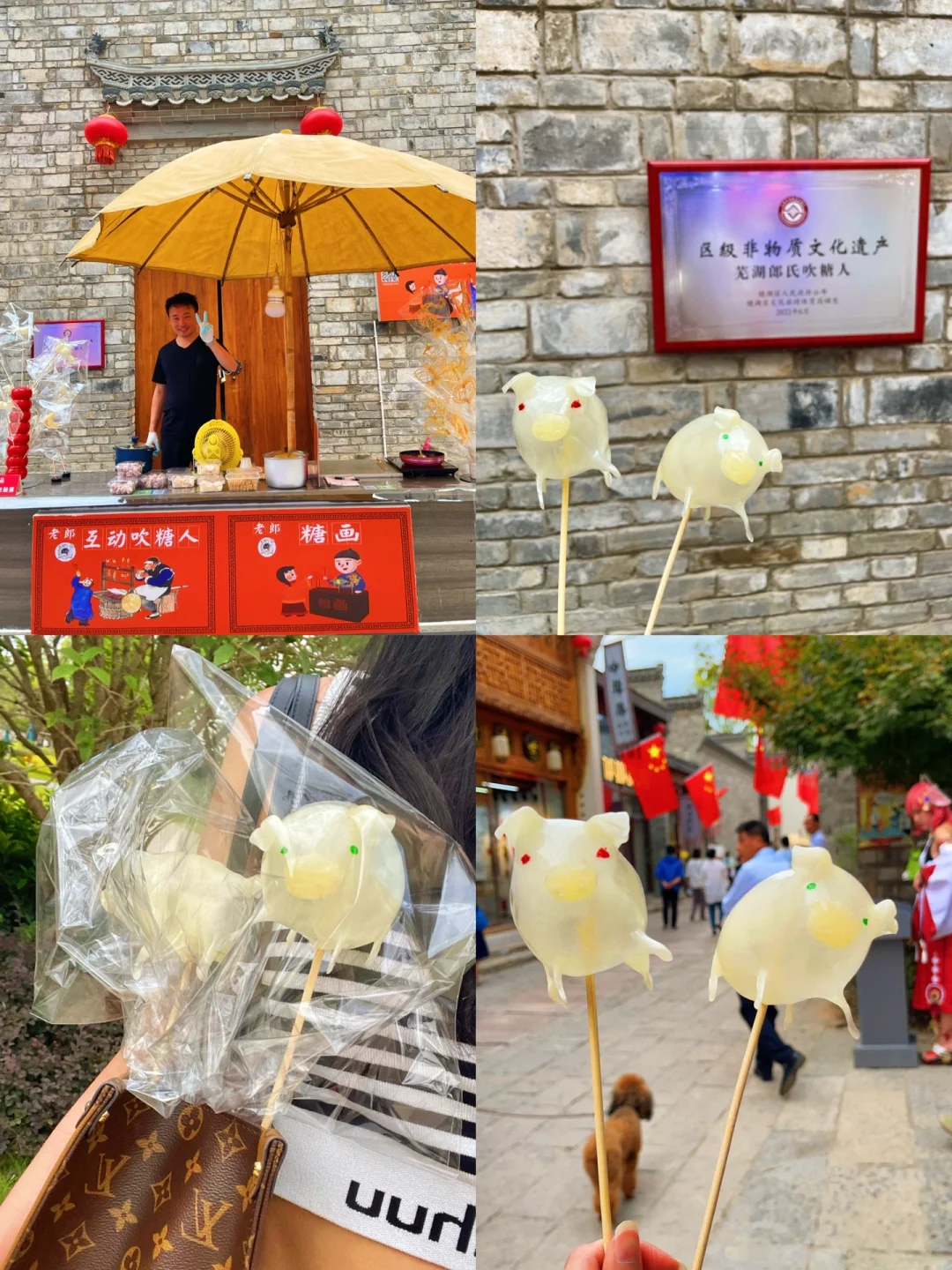 6⃣️老朗互动吹糖人:逛了一圈芜湖古城,被糖画给吸引了,就定制一个芜湖地标糖来拍照,15R就能Get一个,边走边吃糖回头率好高!买完芜湖糖又被隔壁的吹糖画给吸引,原来这个糖画是非物质文化遗产,选一下自己喜欢的动物,一边吹气可以一边和老板互动,他能捏出你想要的动物!真的太有意思了!我吹了两只小猪带回深圳给我妹,她可喜欢了!