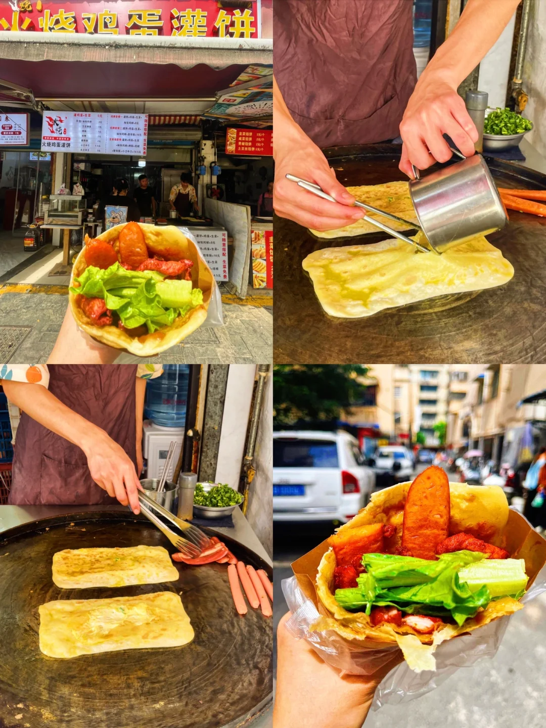 1⃣️火烧鸡蛋灌饼:点的是灌饼➕鸡蛋➕生菜➕脆骨肠➕鸡柳 10R,用蛋液灌进饼里,脆骨肠对切放成多条鸡柳一块一块的,饼皮吃起来挺软、脆骨肠很好吃,鸡柳很香,整体口感还是不错适合当早餐。