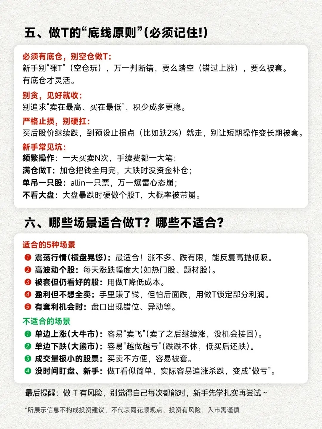 死磕一只股做T,10万赚9.2万:不追热点,只赚差价的实操打法10万本金,一年紧盯一只储能股,没换标的没追热点,靠做T把持仓成本从17.5元压到8.7元,最终净赚9.2万。A股T+1规则下,单一标的盈利核心是用底仓撬动当日差价,股数不变,收益持续累积。2024年7月某消费股,底仓保持65%持仓,35%资金灵活做T,单月收益比满仓死拿高4.3个百分点。2022年身边亲友尝试空仓做T,判断失误后踏空,错过个股16.2%的涨幅。2023年10月某科技股,震荡上涨行情中执行正T,底仓1000股打底,底部区间补400股,1小时反弹3.2%后卖出新增部分,单次收益3%。2024年2月某化工股,顶部滞涨时做反T,股价冲高13.8元卖300股,回落12.5元买回,单笔赚390元。2024年5月某医药股,早盘冲高2.2%远离分时均线,按信号观望,午后果然回调2%。2024年4月某半导体股,跌破分时均线后15分钟未收回,果断卖出,避免后续再跌2.7%。2023年12月某科技股,拉升3.3%时成交量仅为前一日一半,卖出部分底仓,后续股价跌2.5%。2023年9月某热门股,单日换手率18.8%时坚持做T,最终亏损3.2%。2024年6月某光伏股,9:37急跌2.9%,补仓后10:12反弹2.4%卖出,单次收益2.2%。2024年3月某新能源股,14:46触及预设止损线,立即卖出补仓部分,避免亏损扩大。2022年曾单日做T4次,2次判断失误,亏损1.4%。2024年4月某半导体股,开盘跌3.2%后成交量持续萎缩,补仓500股,半小时后反弹2.7%卖出。2023年11月某消费股,高开4.2%后拉升1.7%未涨停,卖300股底仓,午后回落2.2%买回。2024年1月某化工股,早盘三次探底后低点抬升,第三次探底补仓,尾盘涨2%卖出。2024年5月某化工股,委比+33%但股价横盘,补仓后1小时涨2.2%卖出。2023年11月新能源板块震荡,个股跟随板块涨跌,做T胜率从42%提升至67%。2024年2月某医药股,突发政策利好高开5.2%,成交量仅增12%,卖出后股价回落3.2%买回。2023年全年累计做T54次,单次平均收益1.5%,总收益远超单纯持股。2024年6月某医药股,补仓后跌2.3%,按预设止损点离场,避免长期被套。2024年6月某消费股,补仓金额达底仓63%,股价跌2.2%后亏损比预期多1倍。2023年某科技股,财报显示净利润下滑43%,停止做T后该股持续下跌13.2%。2023年震荡行情中,做T收益占全年总收益的62%。2024年AI题材股,日均波动3.3%-5.2%,做T机会远多于低波动个股。2023年5月套牢的新能源股,12次做T后成本从18.3元降至14.2元,半年后解套盈利。2024年7月某光伏股,触及布林带下轨后缩量,补仓后反弹至中轨卖出,单次收益2.3%。2023年某消费股分红前做T,除权后成本核算偏差,亏损1.6%。2022年朋友用50%融资杠杆做T,个股回调3%触发平仓线,被迫止损。2024年5月某小盘科技股,补仓后15分钟涨2.4%,立即卖出,避免后续快速回落。2023年12月某蓝筹股,北向资金单日流入5.3亿,股价横盘补仓,次日涨2.2%卖出。2024年4月某医药股,突发集采利空低开4.2%,卖300股,尾盘跌1.2%买回。2023年换佣金万1.4的券商后,全年做T手续费节省近2200元。2023年某传媒股,现金流连续为负,做T期间突发暴雷,亏损8.2%。2024年新能源板块单边涨22%,中途做T卖出后无法低价买回,少赚8.3%。2022年熊市期间做T6次,5次亏损,后续暂停操作。2023年某冷门股,做T时卖出后无法及时买回,错失反弹。没时间盯盘的投资者和新手,不适合做T。一年死磕一只股做T,核心是吃透标的波动规律。用可控的风险换取稳定差价,不用追涨停、不用频繁换股,小收益累积起来就是可观利润。你们做T时,最常遇到的问题是卖飞还是止损不及时?评论区交流你的经验。