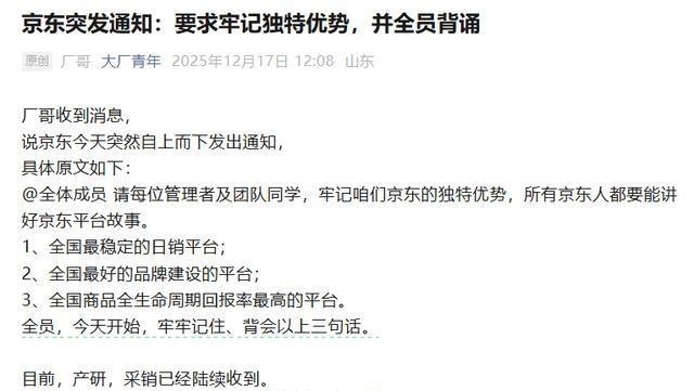 网传京东要求全员背诵「三句话」并设为屏保?如何评价这波操作?究竟是企业文化创新,还是职场内卷新形态? 网传京东最近突然要求所有员工背诵三句话——「全国最稳定的日销平台」「全国最好的品牌建设的平台」「全国商品全生命周期回报率最高的平台」,还得把海报做成工作设备的屏保,睁眼闭眼都得看着。消息传开后,网友都乐了:有人吐槽「打工还要背课文,梦回学校早自习」,有人调侃「这是企业版思想品德课」,也有人质疑「屏保治不了焦虑,不如多发点钱」。 ------------------------------------ 东哥是学社会学的大佬。 知道怎么管理几十万人,网友就别抄心了,先统一自己家庭的声音吧。