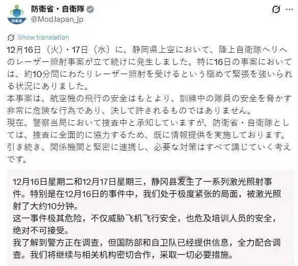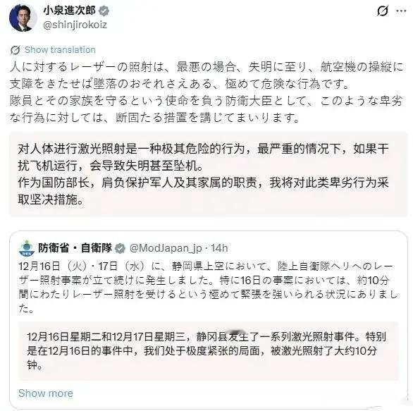 日本战机又被照,防卫相彻底急了,日网民臆测:中国干的! 这波炒作看着热闹,实则是日方自导自演的“碰瓷”大戏!12月6日下午,日本空自F-15J战机两次抵近辽宁舰编队演训区,被中方歼-15舰载机用火控雷达断续照射,这事本是日方挑衅在先的必然结果,却被他们倒打一耙当成了“受害者”剧本素材。防卫相小泉进次郎急得接连开记者会抗议,又是拉美国防长通话,又是在社交媒体晒飞行员旧手套煽情,整套操作下来,反而暴露了心虚的本质。 事实早就摆得明明白白。中方辽宁舰编队在宫古海峡以东公海训练,完全符合国际法,是正当合法的军事活动。日方却偏偏派战机冲闯中方划定的演训区,恶意跟监滋扰,这种危险举动本身就给海空安全埋了雷。火控雷达照射可不是随便用的,只有在对方行为危及自身安全时,才会采取的必要警示措施,说白了就是“你都闯到家门口了,还不许我亮个警戒灯?” 中方甚至提前通过通信通报了日方,可他们揣着明白装糊涂,转头就把“被照射”当成了控诉中国的筹码。 小泉进次郎的“急”,藏着太多表演成分。他先是召开新闻发布会,精确到分钟通报所谓“照射时间”,营造出一副“证据确凿”的样子,转头就被中方放出的现场录音打脸——日方明明收到了中方通报,却辩称“信息不充分”。 见事实层面站不住脚,他又搞起了“摆拍外交”,和美国防长通话前先预告,通话后晒出办公桌上摆着美日国旗的照片,结果被日本网民吐槽“比AI生成图漏洞还多”,连笔都没拿,明显是装样子。更离谱的是,他还晒出一只写着“冷静”“严格”的飞行员旧手套,声称自卫队员“被照射30分钟仍坚守岗位”,可明眼人都知道,被火控雷达锁定等同于被导弹瞄准,专业操作早该迅速撤离,哪有停留半小时的道理? 日网民的臆测更是被情绪带偏,不少人跟着喊“中国挑衅”,但也有清醒的声音戳破了逻辑漏洞。有网友反问“30分钟足够F-15J飞回基地,为什么要留在危险区域?” 还有人直指核心:“士兵坚守是职责,该解释的是谁下的命令让战机去挑衅?” 其实日方民众心里也清楚,这种炒作不是第一次了,今年7月就曾污蔑中国军机“异常接近”其侦察机,最后被中方证实是日方侦察机先闯入中国东海防空识别区抵近侦察。 日方这么急着跳脚,根本目的不是讨说法,而是为扩充军备、突破“专守防卫”找借口。近期日本首相高市早苗频频发表涉台错误言论,渲染“中国威胁论”,背后就是想推动军费上涨、让自卫队获得更大军事行动权限。这次“雷达照射”事件,刚好成了他们的“东风”——小泉进次郎借着这事向美国要支持,要求提升美日联合军演频率、转让先进军事技术,可美方只含糊回应“交换意见”,不仅没公开谴责中国,还借机要求日本将军费提升至GDP的5%,让日方偷鸡不成蚀把米。 更让日方焦虑的是,军事层面的差距已经藏不住了。这次中俄联合战略巡航,轰-6K和图-95MS轰炸机编队一度飞到距离东京700公里的空域,处于巡航导弹打击范围之内,而日本现有监测系统根本难以应对中方先进战机的隐蔽接敌能力。他们嘴上喊着“中国威胁”,心里其实怕的是自己挑衅后没能力应对反制,只能靠炒作舆论给自己壮胆。 中方的回应一直克制且专业,多次明确指出日方是“贼喊捉贼、倒打一耙”,警告其不要重走军国主义邪路。但克制不代表软弱,对于这种上门挑衅还反咬一口的行为,必要的警示和反击绝不会少。日方如果继续沉迷于“碰瓷”炒作,无视自身挑衅的本质,只会进一步侵蚀中日之间本就脆弱的战略互信,让地区紧张局势升级。 这场闹剧的核心,从来不是“战机被不被照”,而是日方想借着制造对立,实现自己的军事扩张野心。小泉进次郎的急吼吼,日本网民的被带偏,都是这一野心下的附属品。国际社会的眼睛是雪亮的,谁在维护稳定,谁在制造麻烦,一目了然。 各位读者你们怎么看?欢迎在评论区讨论。