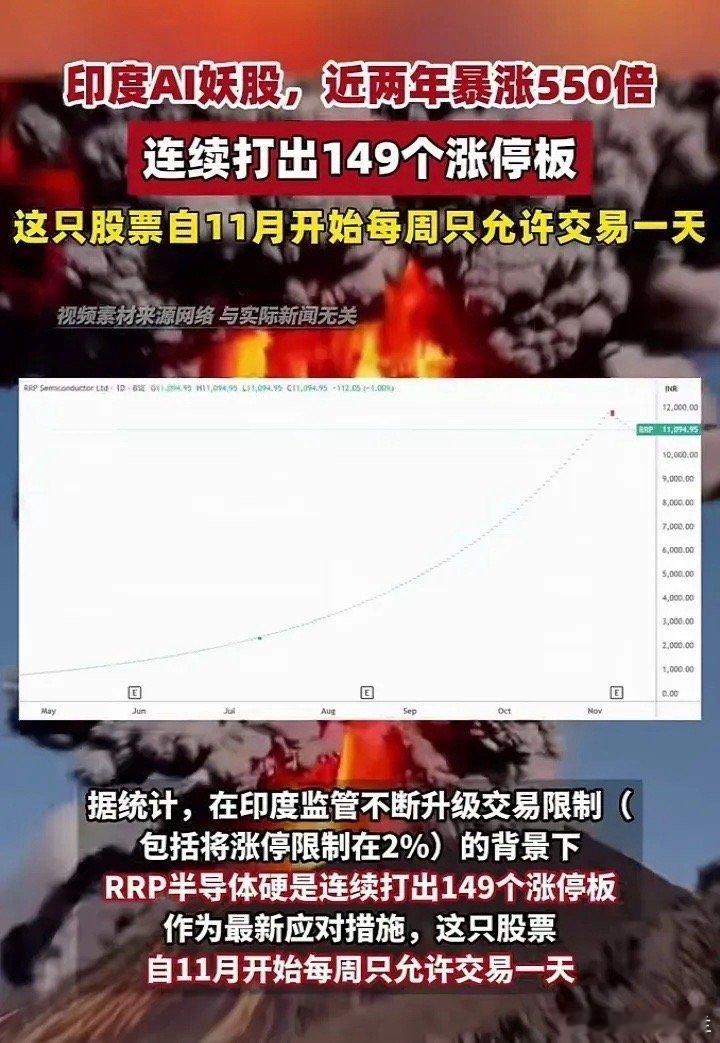国内很多股民对寒武纪、摩尔线程、沐曦股份股价的大涨不理解,认为这几家人工智能芯片股营收都不高,寒武纪刚实现盈利,摩尔线程和沐曦股份还亏损较大,寒武纪市值超过5000亿,摩尔线程、沐曦股份市值都超过3000亿太夸张了。但估值要横向对比,现在全世界AI芯片股都很疯,美国那边烈火烹油,英伟达最高都超过5万亿美元市值,而印度也有个芯片股RRP半导体,近两年暴涨550倍,出现过连续149个涨停。印度这家公司目前市值17亿美元,年报中仅有两名全职员工,营业收入竟然是负的6820万卢比(约合532万人民币),净亏损7150万卢比。由于这个AI概念股太妖,印度监管部门已经把它的涨停限制在2%。最新的应对措施是11月开始每周只允许交易一天。不过RRP半导体的市值17亿美元,和寒武纪、摩尔线程、沐曦股份还相差很远。