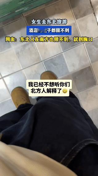 南方女生勇闯东北,进酒店浴室直接懵圈——抬头找半天,镜子就露个上沿,脸都照不全!对着镜子吐槽“这镜子是给巨人用的吧”,北方网友火速赶来辩白:“俺们东北人在南方也照不到下半张脸,主打一个南北互相伤害!” 现在妹子摆烂:“不想听北方人解释了,这镜子的身高门槛我是跨不过去了[笑哭]”南方女生 南方人看傻了