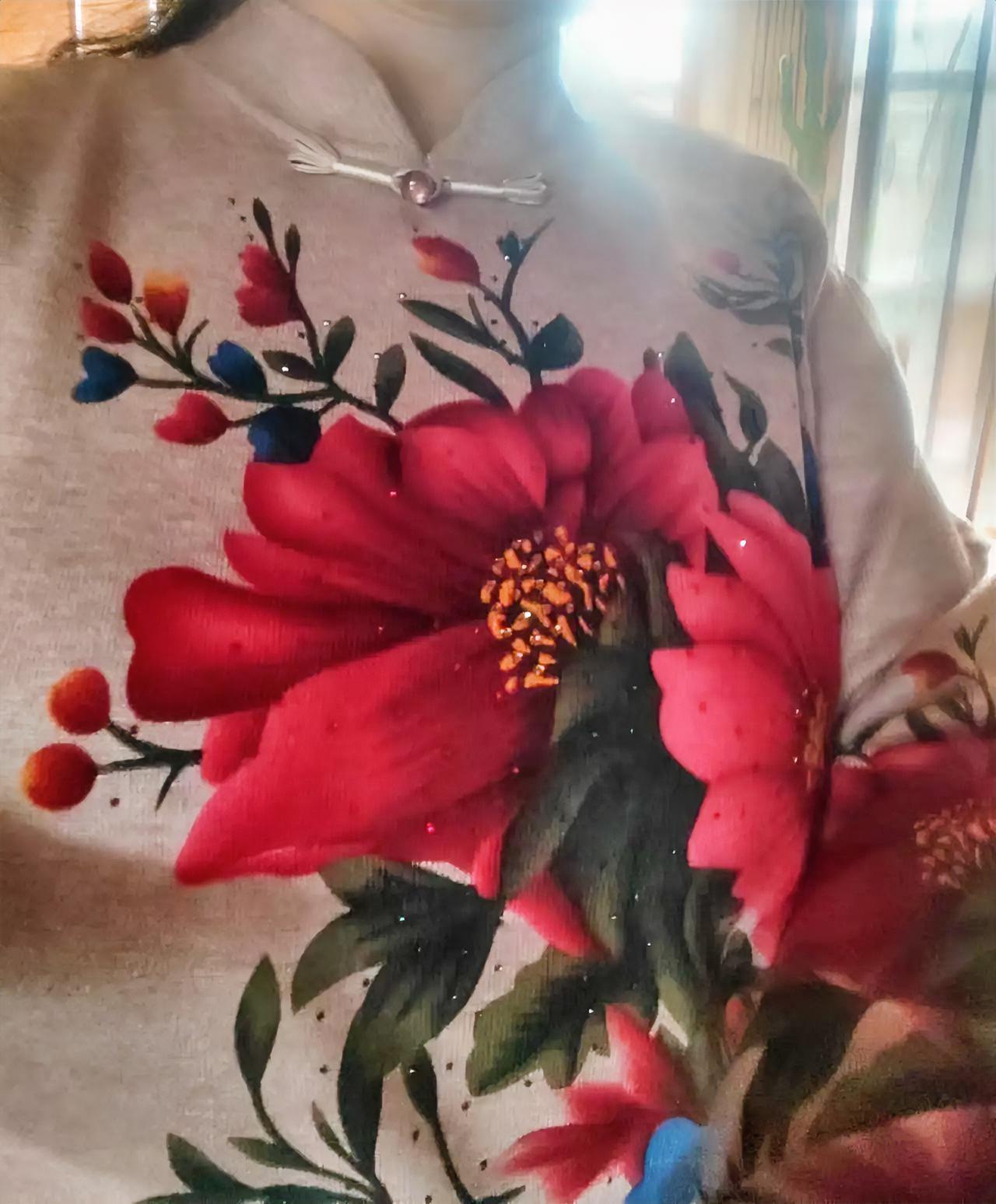 快过年了,每年过新年以前,我都会给自己买件新衣服,来犒劳一下辛苦了一年的自己。 前几天刚买了一件羊毛衫,穿了给女儿炫耀 ,女儿说我,大花小牡丹的,越来越没有品味。哈哈,自己感觉好靓啊!