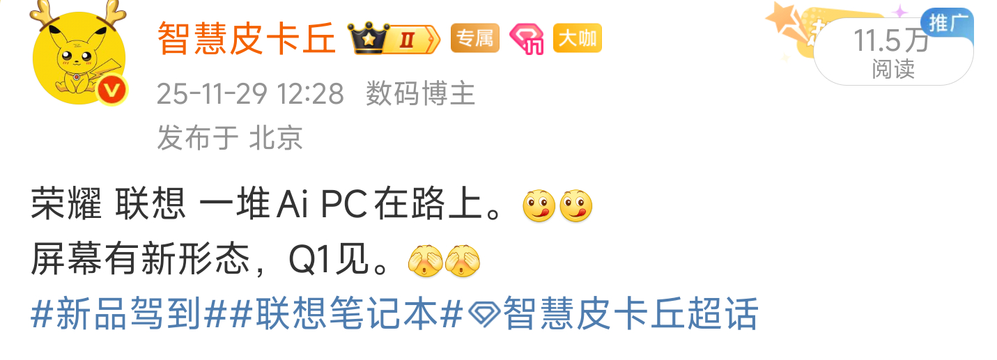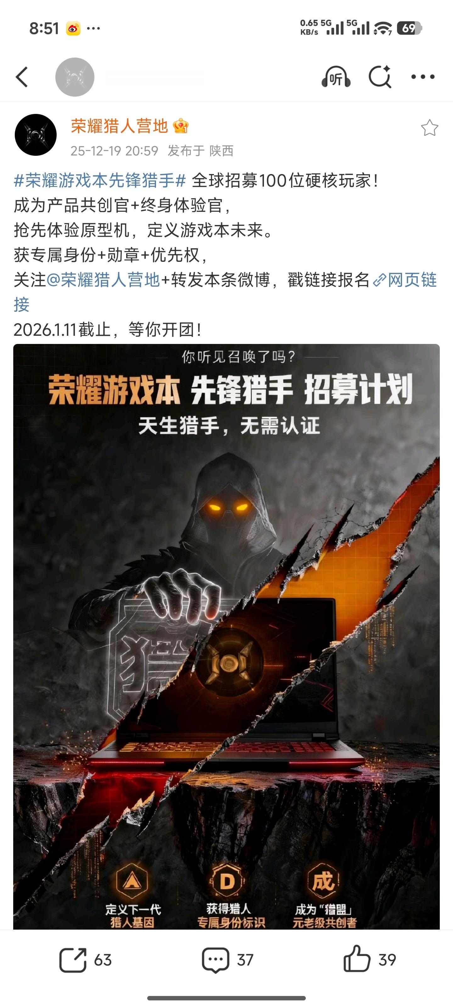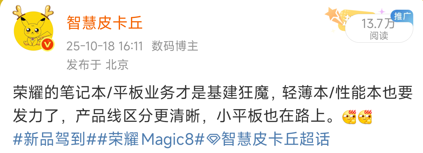 和大家透漏过的荣耀笔记本开始招募了。全新产品线定义,Ai赋能,游戏本回归。期待林总刀法,排期和超大杯差不多。荣耀游戏本先锋猎手新品驾到智慧皮卡丘 西安·西安荣耀终端有限公司