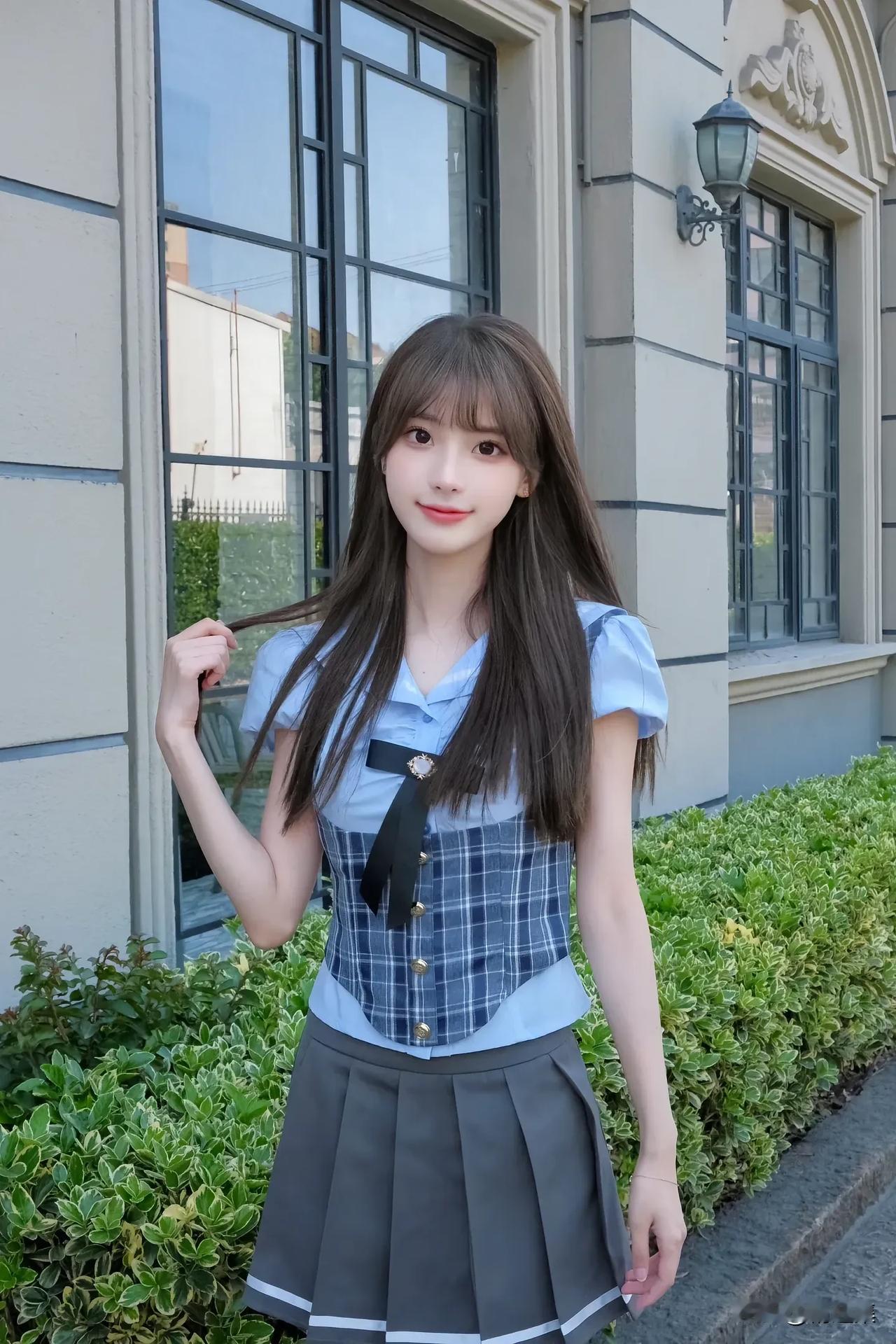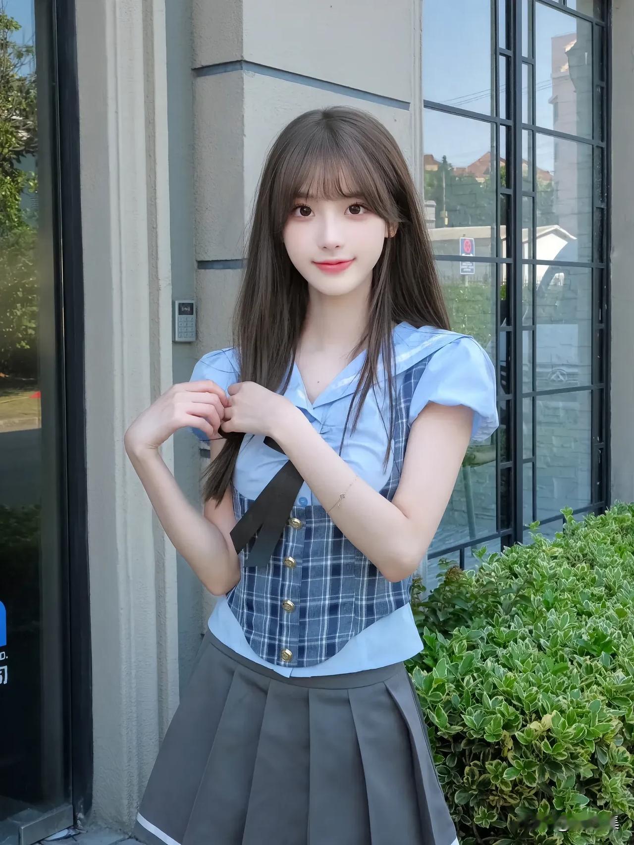 青春洋溢的校园少女,微笑着倚靠在绿植旁,阳光洒满她的脸庞。