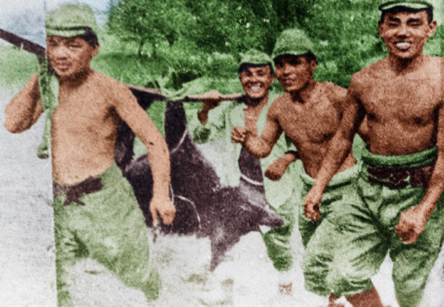 这是日军侵占云南腾冲期间掠夺民间物资的暴行现场,几名赤裸上身的日军士兵神态嚣张,正抬着从村民处抢来的猪。 1942年5月腾冲沦陷后,日军在滇西实施“以战养战”的掠夺政策,不仅抢占粮食、矿产,还肆意劫掠村民的家畜(猪、牛、鸡等)作为军粮。腾冲地处滇西边境,村民多以养殖家畜维持生计,日军的掠夺直接断了百姓的生存来源,同时将抢来的家畜集中屠宰,供驻腾冲的日军部队食用。这种掠夺伴随日军的占领全程,直到1944年中国远征军发动腾冲战役、收复失地,当地百姓的生计才逐渐恢复。