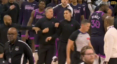 猛!芬奇进场“追杀”裁判,6分钟被罚离场。 首节6分钟时,华子帅气突破要哨没吹,兰德尔再攻被3人夹击掉球(图2)。 森林狼双核要犯规均被无视,直接弃防消极比赛以示抗议。芬奇见了,直接上场追杀裁判(图5)。 芬奇被拦着后还玩了个回马枪,哈哈(图3-4)。 他绝对是联盟最“护犊子”、喷裁判最凶的教练,这一出后帅位稳如狗!