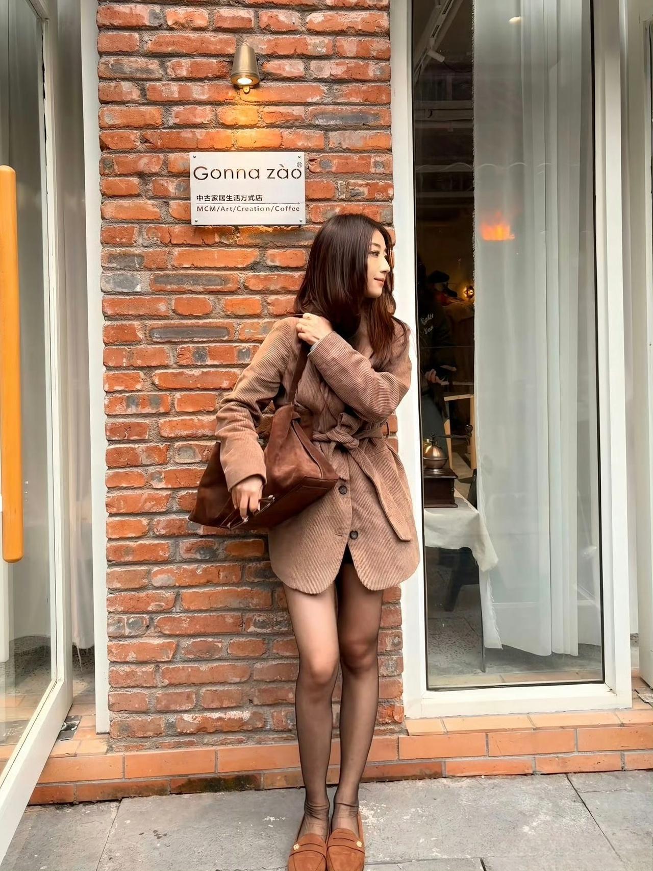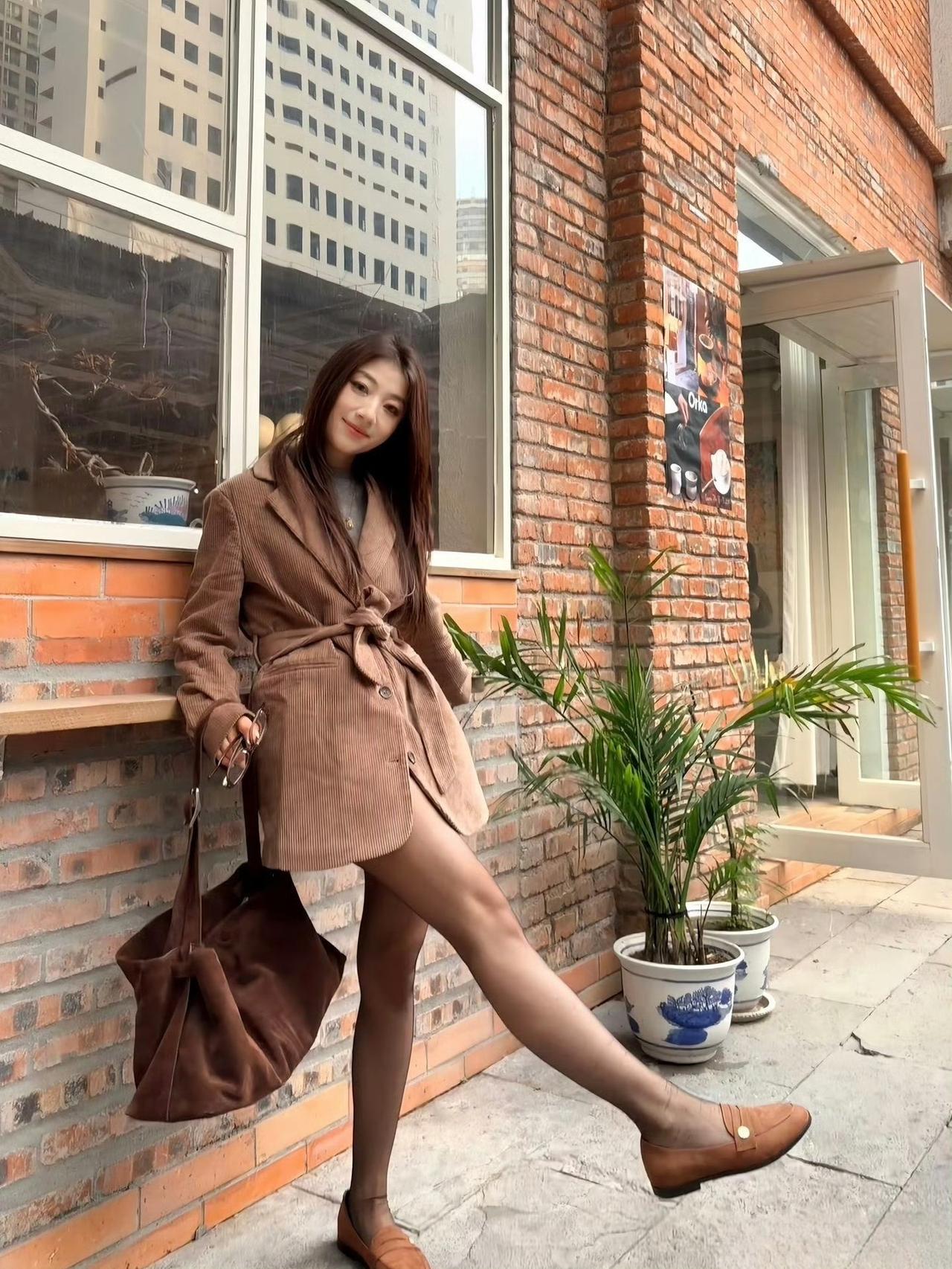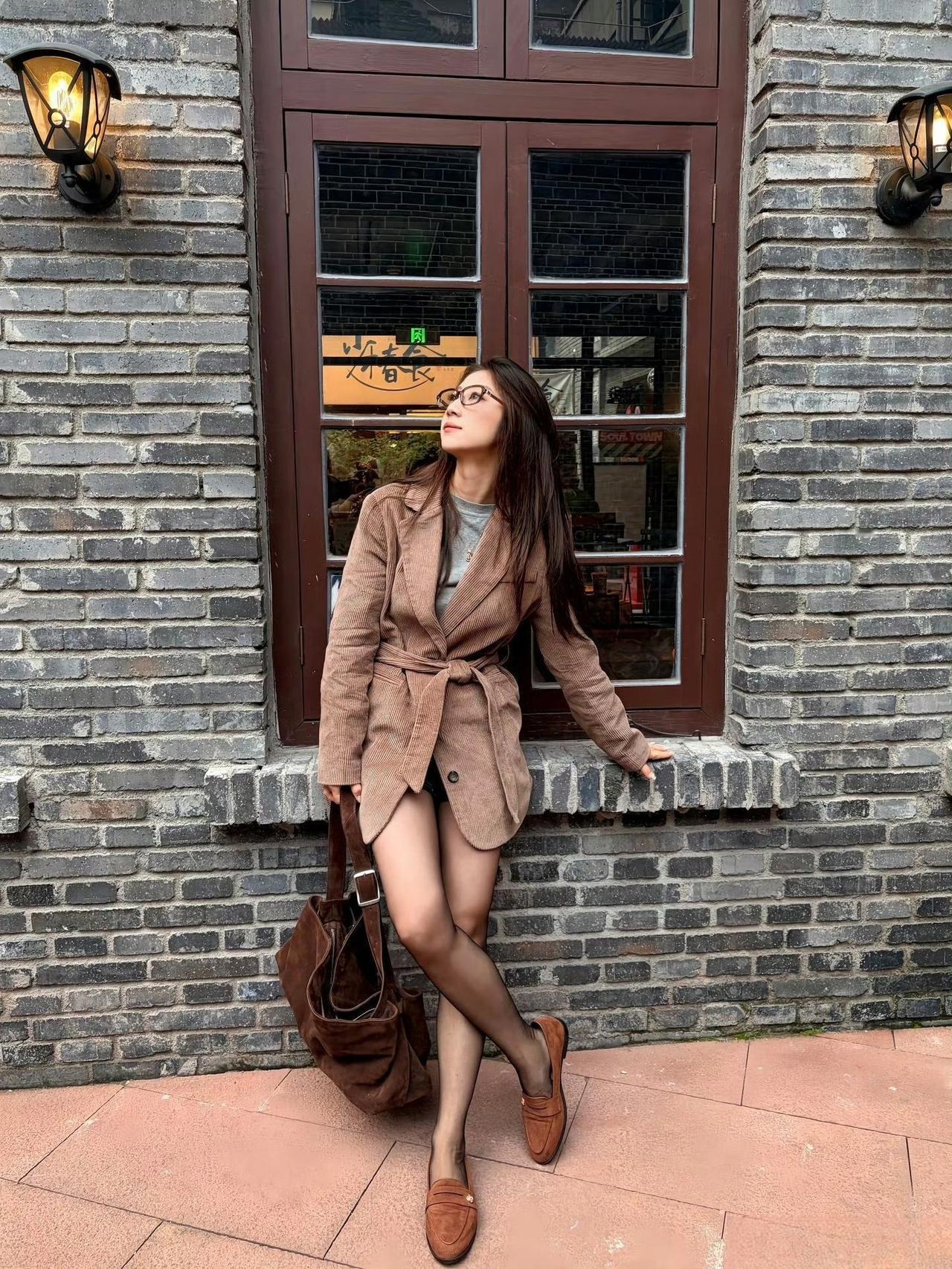 这套穿搭是复古松弛的棕系轻熟风,温柔慵懒又自带文艺质感。卡其棕系带西装外套自带复古氛围,宽松版型+收腰设计平衡了休闲与利落;内搭浅灰打底+短裤,简约基础款让棕系色调更显柔和,适配日常轻社交场合。 搭配棕色乐福鞋+同色系大包强化棕系统一感,提升整体和谐度;眼镜配饰注入文艺气息,让松弛感更具风格。咖棕色系穿搭 卡其棕穿搭 咖啡棕穿搭