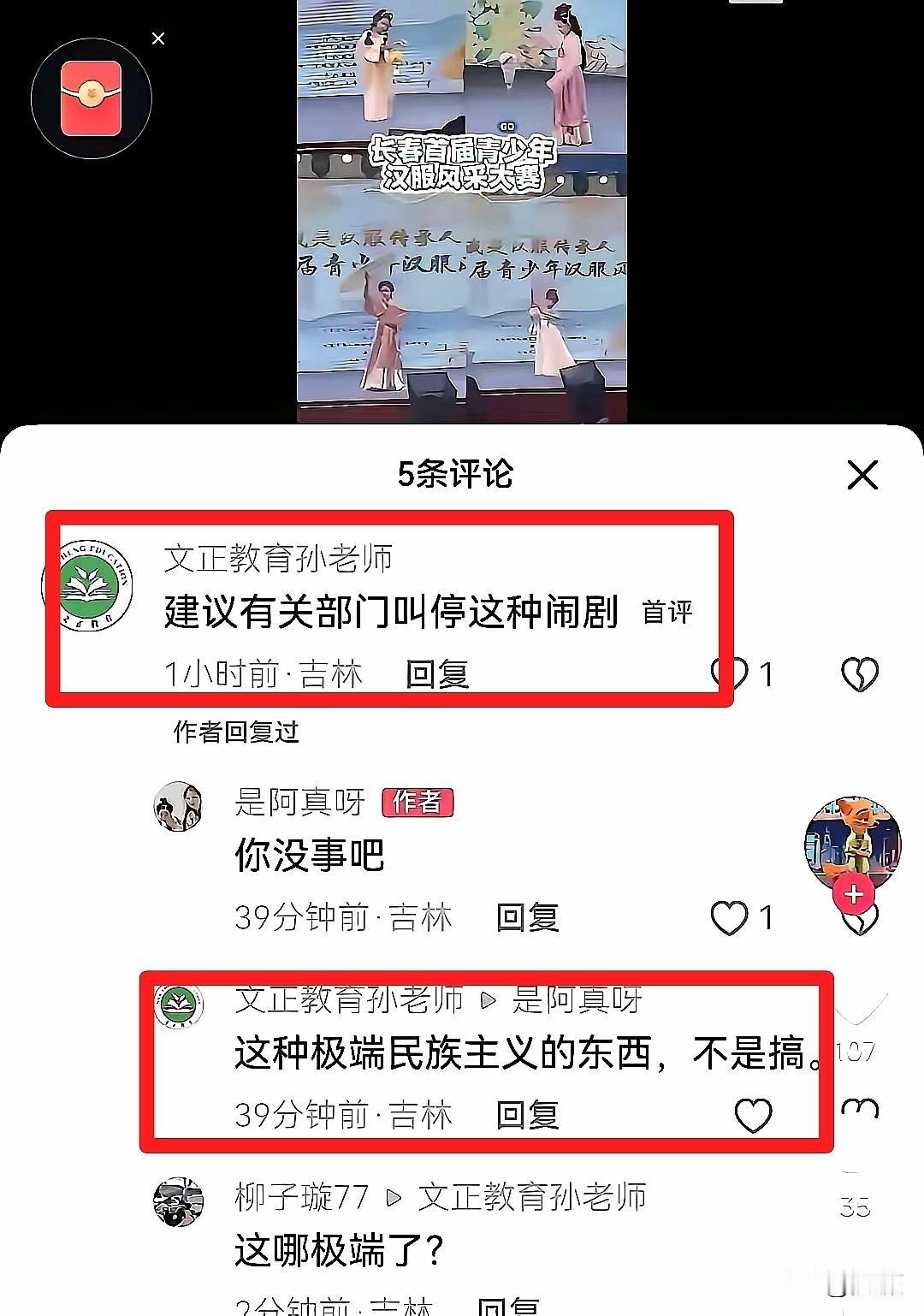 太难了,穿个汉服都要被人扣个屎盆子[捂脸] 吉林长春这场青少年汉服风采大秀可真是惹来不少风波!那位自称文政教育孙老师的,直接给汉服扣上了“极端民族主义”的帽子,还嚷嚷着要叫停表演,这操作真是让人看不懂! 汉服,那是咱们中华文化的瑰宝,穿上它,不仅是对传统的致敬,更是文化自信的体现。这位孙老师,怕是对汉服有啥误解,或者压根儿就没了解过吧? 建议有关部门真得好好查查,他到底是不是真老师,要是,那可得考虑考虑,这样的人还能不能继续教书育人了,毕竟,胡说八道、破坏团结可不是老师的本分! 大家说说,汉服怎么就极端了?是不是有些人太过敏感,或者别有用心?