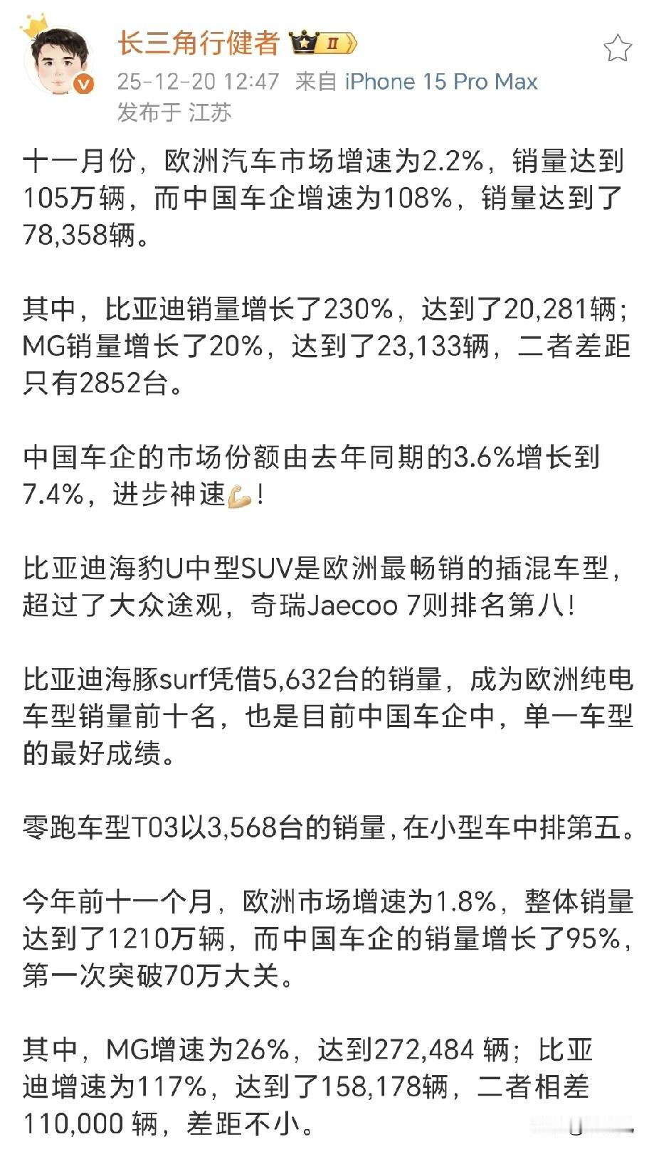 中国车企欧洲突飞猛进,同比增速翻倍还多。 市场份额已经来到7.4%。 比亚迪还是增速最快主流车企。 宋plus已经拿下很多次欧洲插混SUV销冠了。 海鸥最近也在加速交付,11月5632台,杀入欧洲纯电车型销量前十。 目前比亚迪欧洲交付了15.8万台。 全年和我计算的18-20万台差不多。 12月份大概率可以冲三万! 明年还有专门给欧洲市场开发的新插混车型。 加上匈牙利,土耳其工厂投产,欧洲明年的目标应该在50-60万台左右。 比亚迪海外发展 比亚迪销量