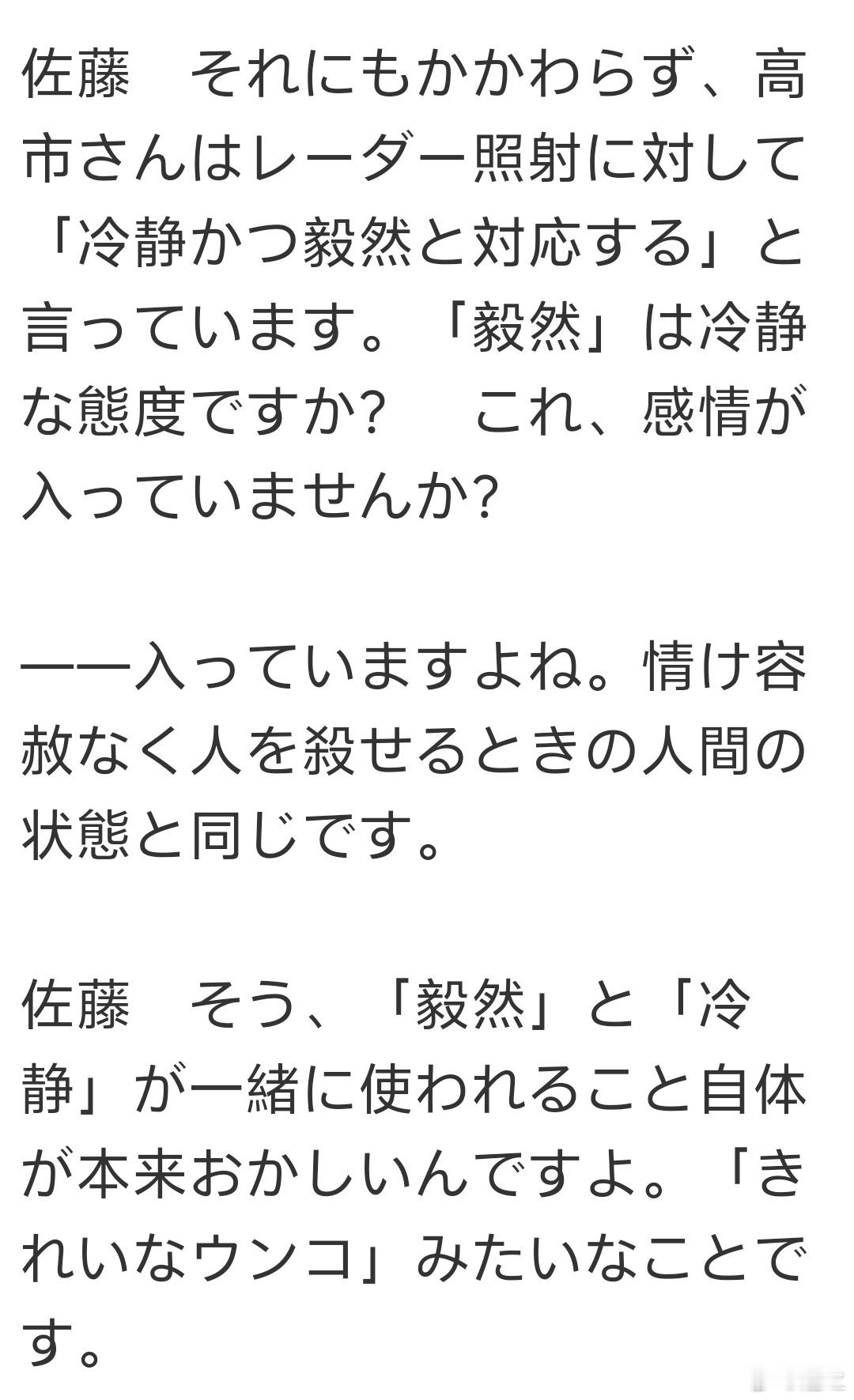 每日海外笑话作家、原日本外务省主任分析官、同志社大学客座教授佐藤优的一篇谈话文章。说到日本政府目前面对中日矛盾一直在强调日本要冷静和毅然的面对。他嘲讽说,冷静和毅然?这俩词一起说出来不感觉奇怪么?就好像是在说要拉个干净的大便一样。