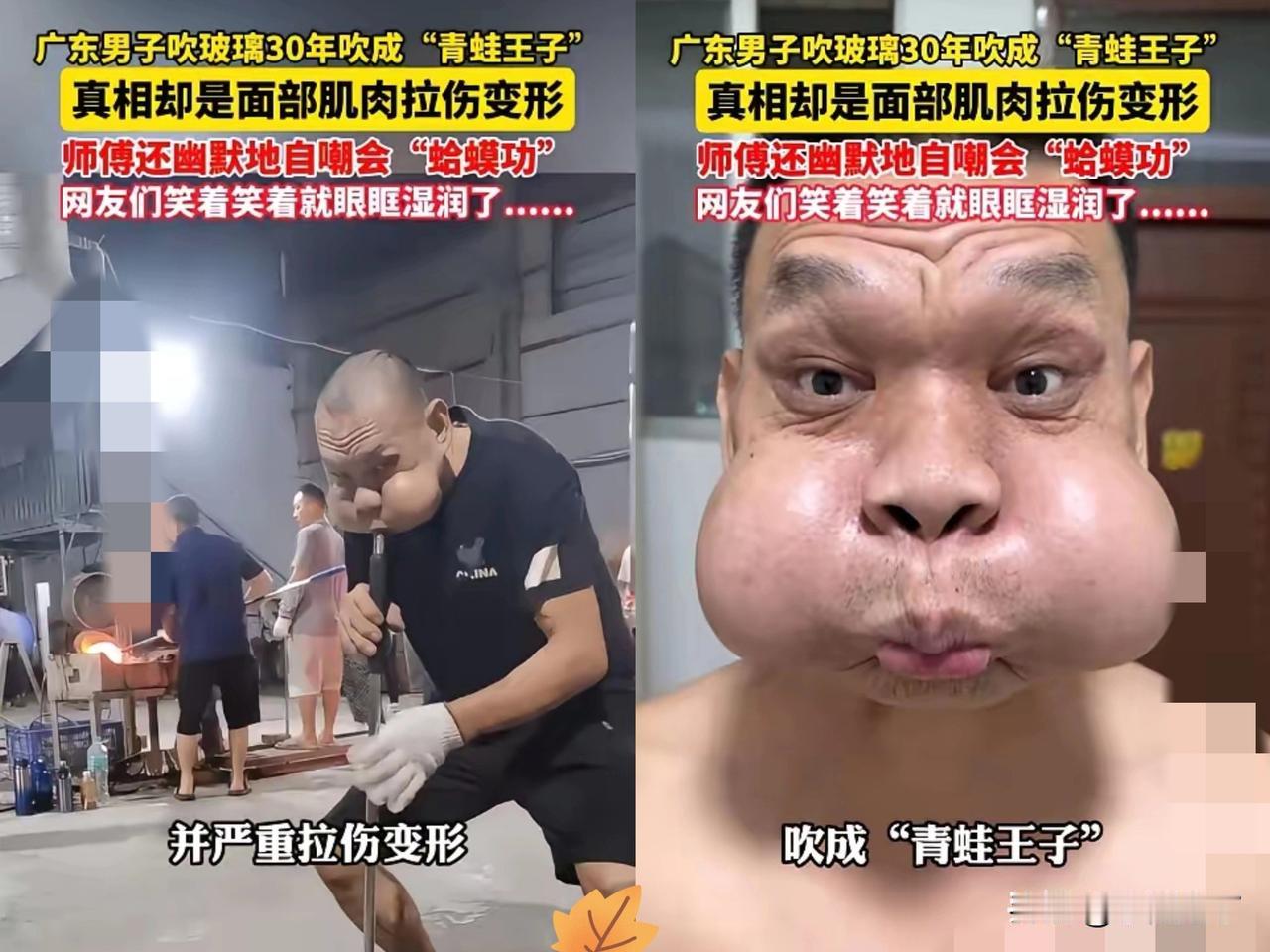 广东,一男子在工厂吹了30年玻璃,一天最多要吹300多个,结果腮帮子变大,面部肌肉严重拉伤,鼓起气来就像青蛙一样!笑着笑着就让人鼻酸! 一天最多吹300多个玻璃制品,30年高强度吹气让他肺活量异于常人,却也把面部肌肉磨得松垮劳损! 他嘴上调侃自己是“青蛙王子”,可这玩笑里藏着的,是手艺人用身体换生计的无尽心酸! 我们总歌颂手艺人的匠心,却常常忽略他们背后的身体代价。每一件精致的玻璃制品,都是用日复一日的劳损换来的! 这哪是什么“熟能生巧”的勋章,不过是为了生活不得不扛下的重担!