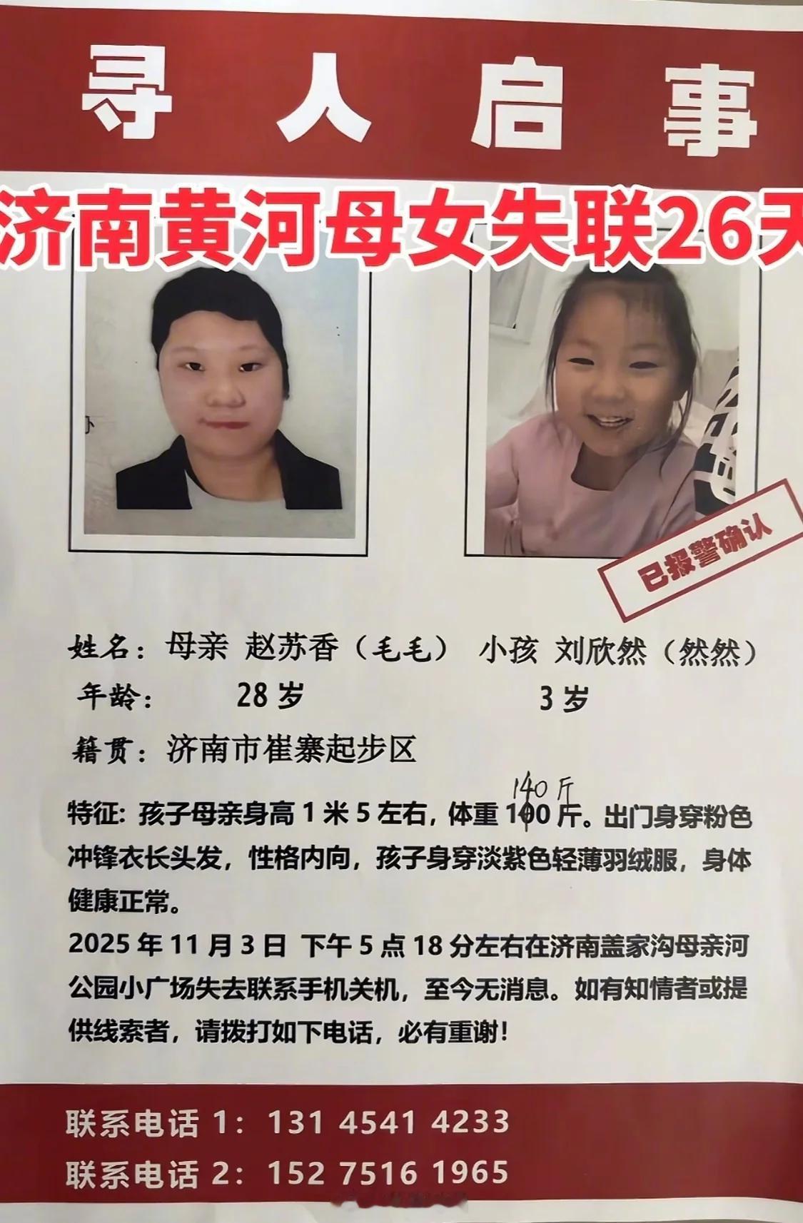 济南一对28岁母亲与3岁女儿失联超40天,监控显示两人曾骑电动车前往黄河岸边公园,附近发现其电动车、背包等物品,怀疑失足落水。 搜寻范围已扩至黄河入海口,出动无人机仍无线索。 黄河岸边公园作为开放公共场所,安全防护设施和警示标识的完善程度仍有不足,这也让母女失足落水的风险有了存在的可能。 这背后反映出相关部门在公共场所安全监管上还有疏漏,亟需加强隐患排查,筑牢民众生命安全的防线。 母女失联超40天仍无线索,即便搜寻范围已扩至入海口并出动无人机,家属仍在煎熬中苦苦等待,搜救工作的难度可想而知,但也让我们看到应急响应机制仍有优化空间,期待能进一步提升搜救效率,给家属一个交代。 这起悲剧深深戳中了大众的痛点,也为全社会敲响了警钟。 很多户外公共场所的安全警示和防护措施还需细化,相关部门应加强安全宣传引导,主动排查整治隐患。 同时,社会对未成年人户外安全的保护机制也需完善,让危险区域能真正做到防患于未然。 这起事件是对公共安全体系的一次提醒,唯有尽快补齐安全防护与应急搜救的短板,才能更好地守护每个家庭的平安,避免类似悲剧再次发生。 济南正安公益救援队负责人告诉记者,目前失联人员还未找到,搜寻工作仍在继续。
