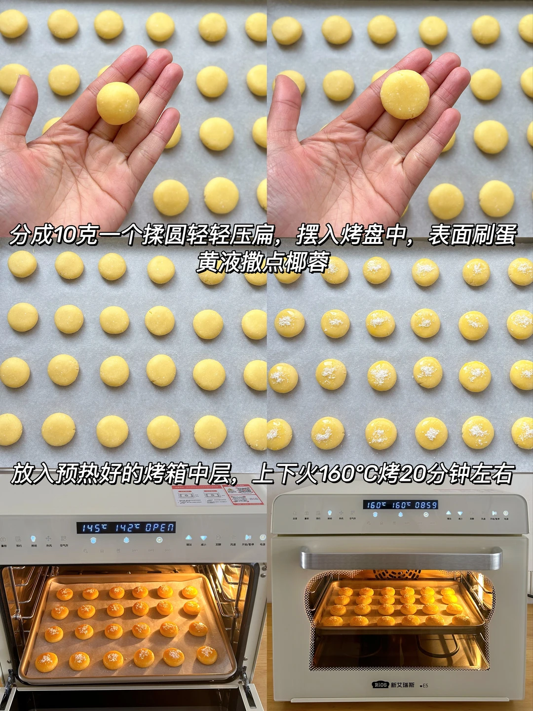 3️⃣将面团分成10g一个揉圆稍微按扁,放入烤盘.表面刷蛋黄液撒点椰蓉,